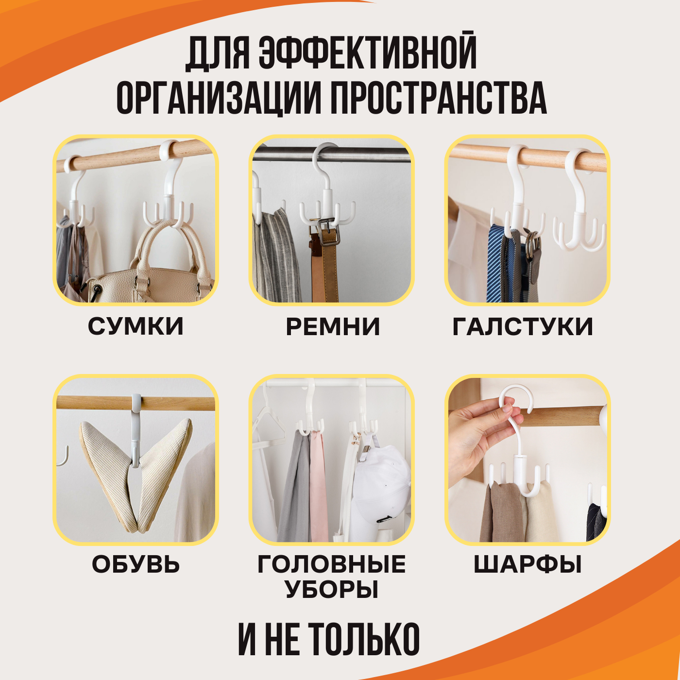 | Дополнительная информация | Вешалка для шкафа с вращением, Поворотный крючок органайзер для одежды, ремней, сумок, платков, шарфов |