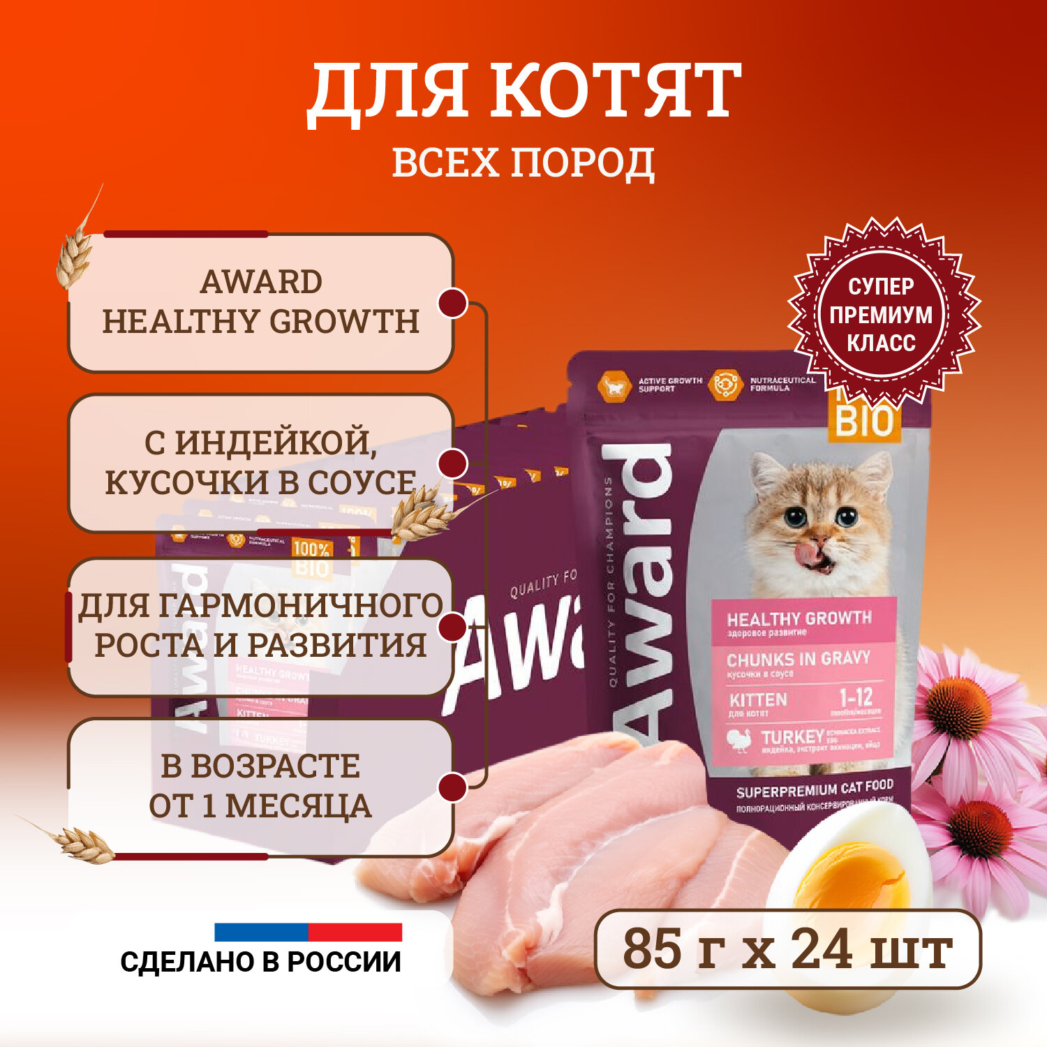 AWARD Healthy Growth влажный корм для котят от 1 месяца, кусочки в соусе с индейкой, в паучах - 85 г х 24 шт информация: