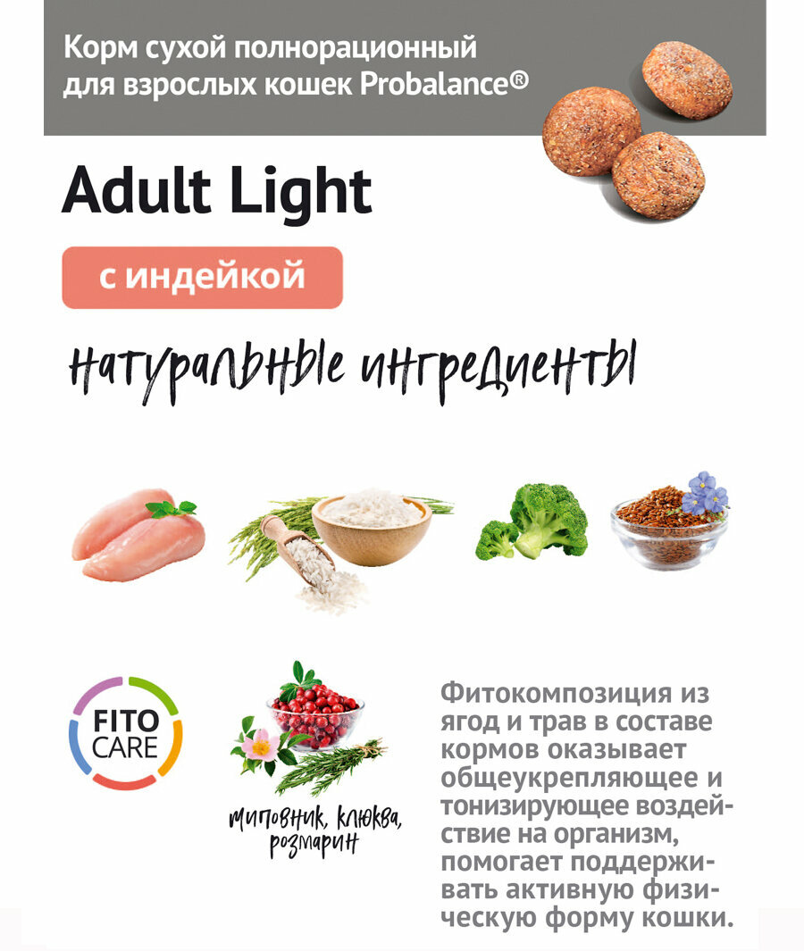 Сухой корм Probalance Adult Light Turkey для кошек с нормальной и низкой активностью с индейкой, 10 кг информация: