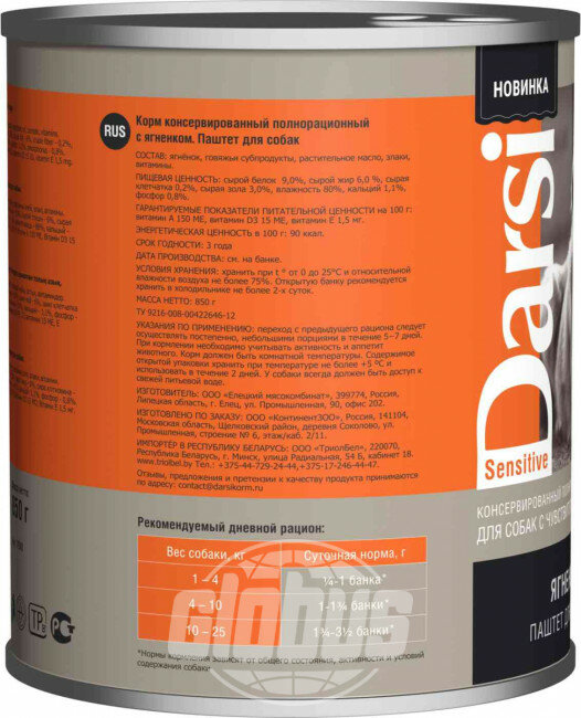 Darsi Консервы "Ягненок" для собак с чувствительным пищеварением, паштет 0.85 кг информация: