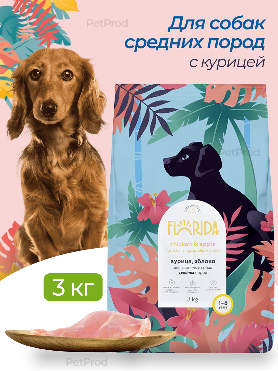 10 цен на Сухой корм FLORIDA для взрослых собак средних пород: курица с яблоком 3кг