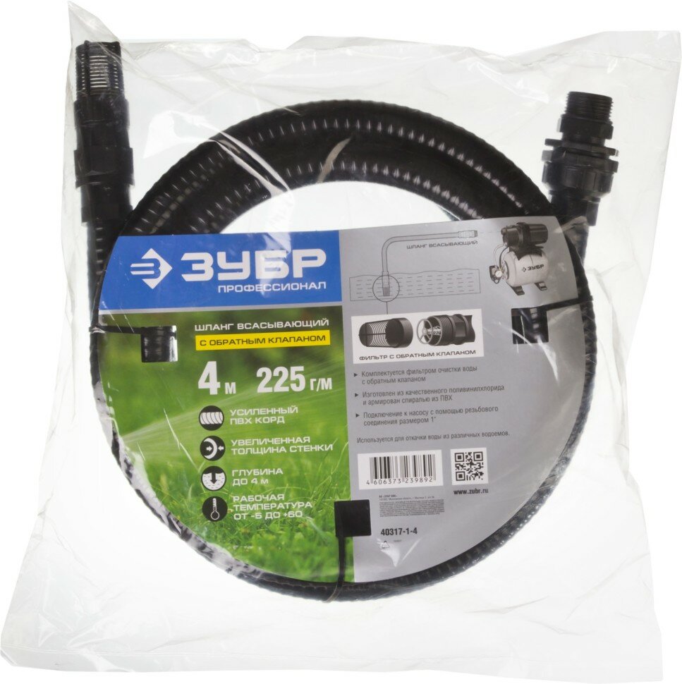 ЗУБР Шланг всасывающий, с фильтром и обратным клапаном, 1", 4м, ( 40317-1-4 ) информация: