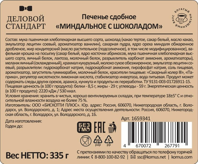 Печенье сдобное Деловой Стандарт Миндальное с шоколадом 335 г информация: