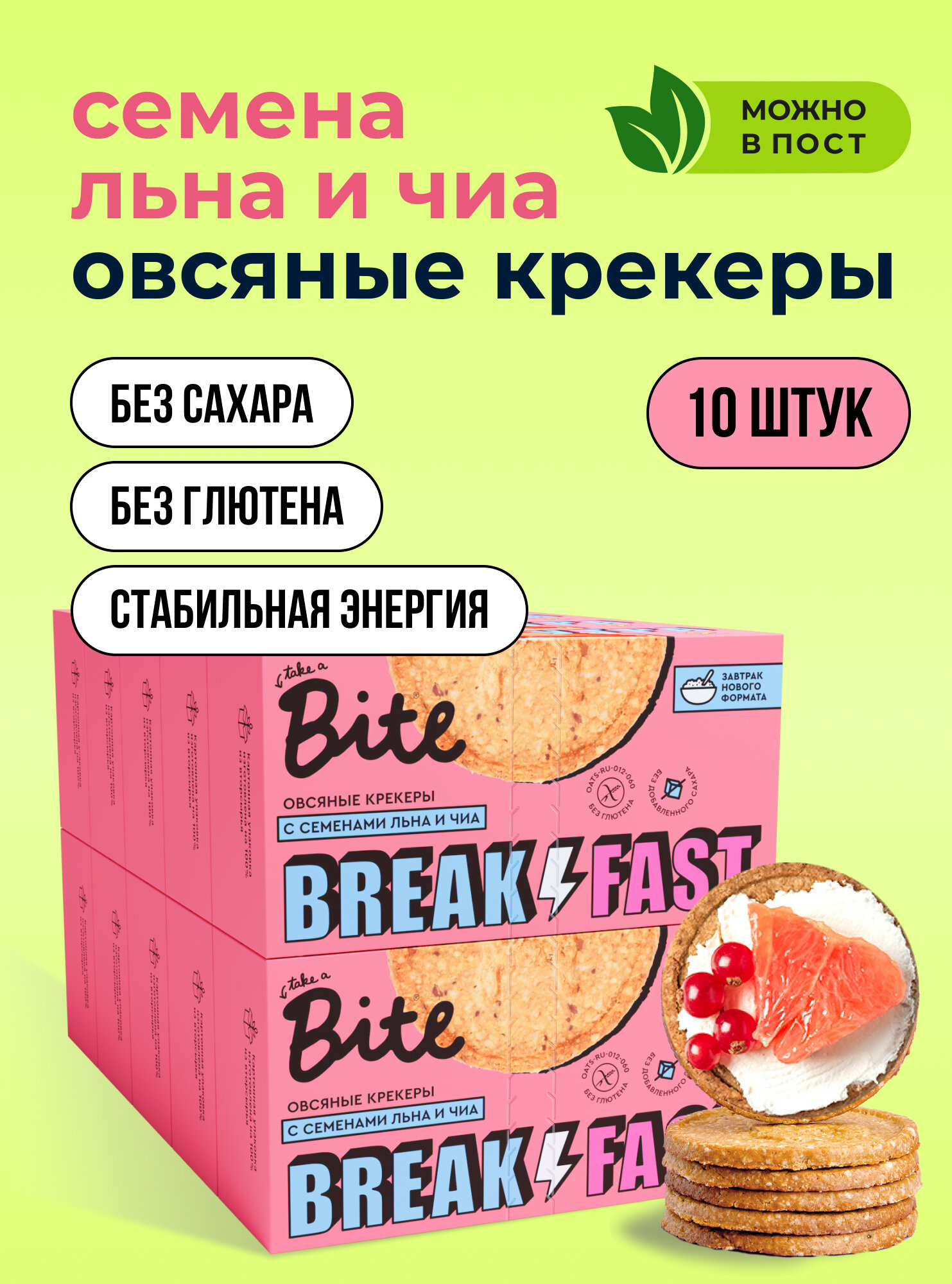 Печенье без сахара овсяное Take a Bite / Крекеры для завтрака, с семенами льна и чиа, без глютена, 10 шт по 200 гр информация: