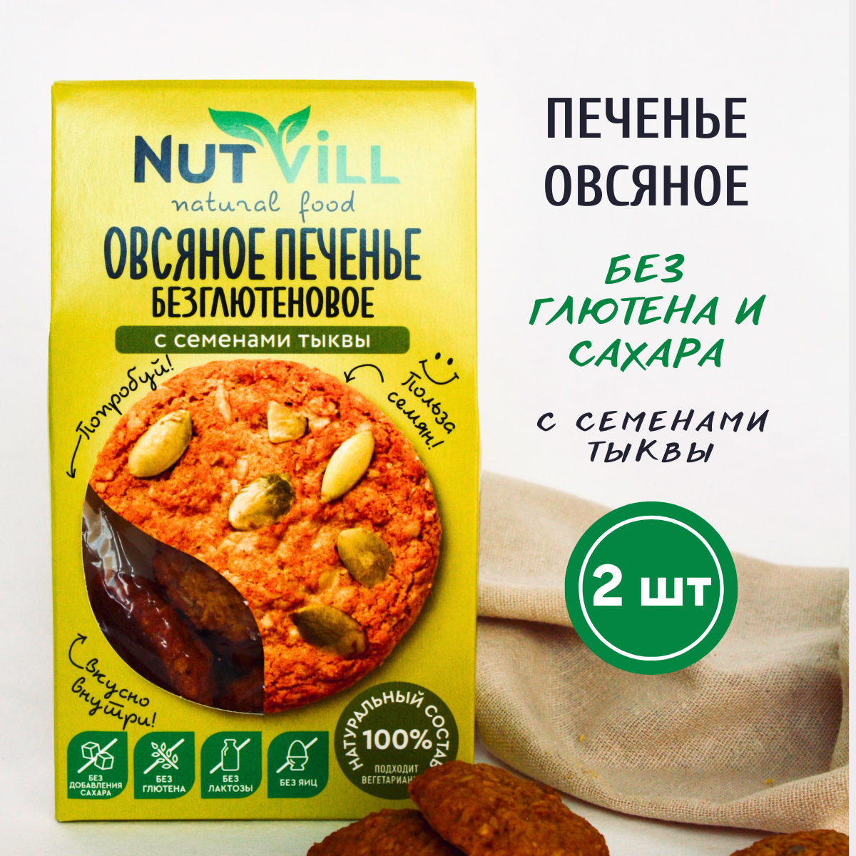 Печенье овсяное безглютеновое "С семенами тыквы" без сахара Nutvill, 85 гр (2 шт. в наборе) информация: