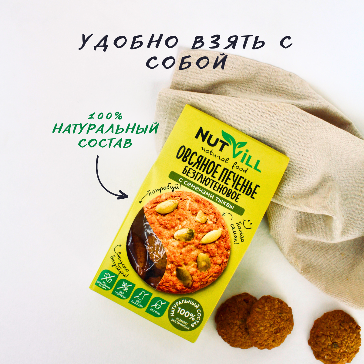 NutVill Печенье овсяное С семенами тыквы без сахара без глютена, 3 шт. 639 ₽