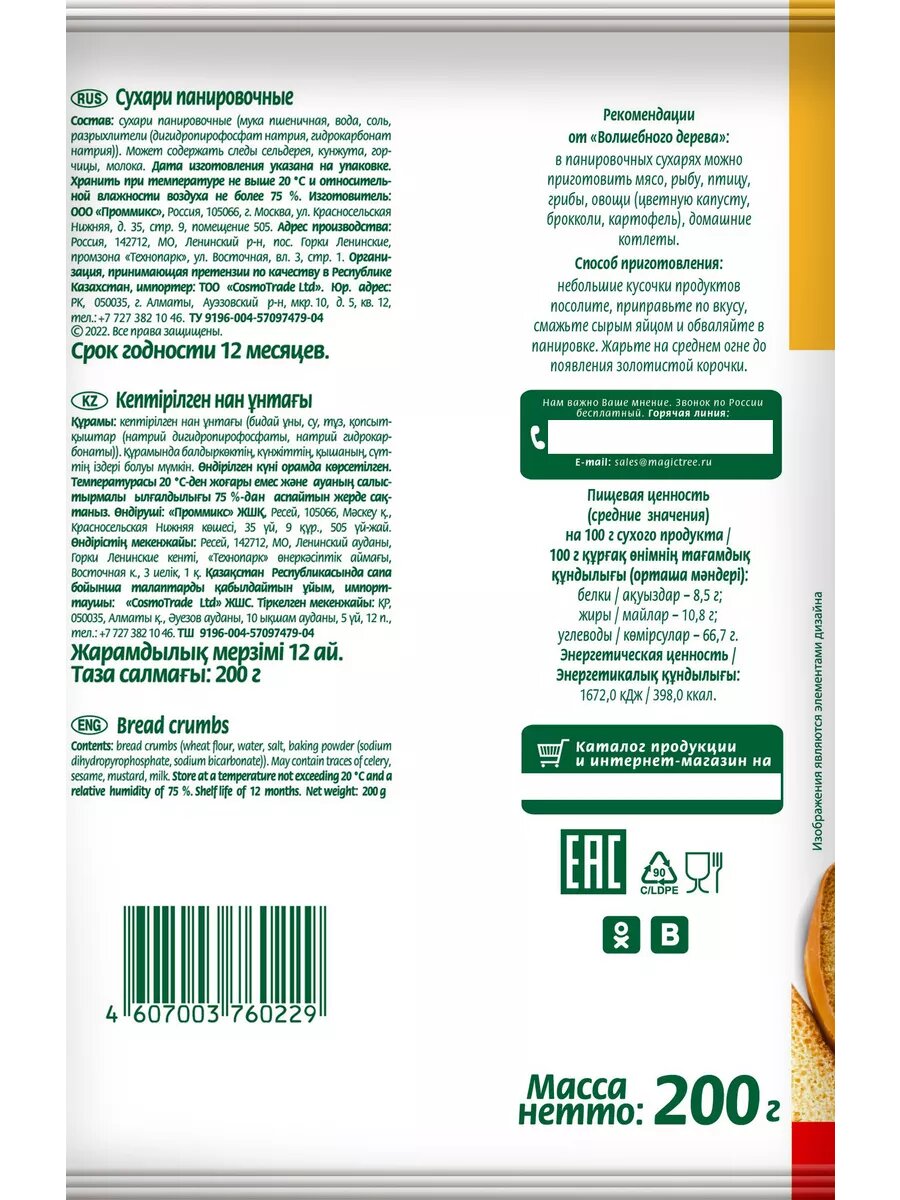 | Дополнительная информация | В комплекте 3 пачки панировочных сухарей по 200г |