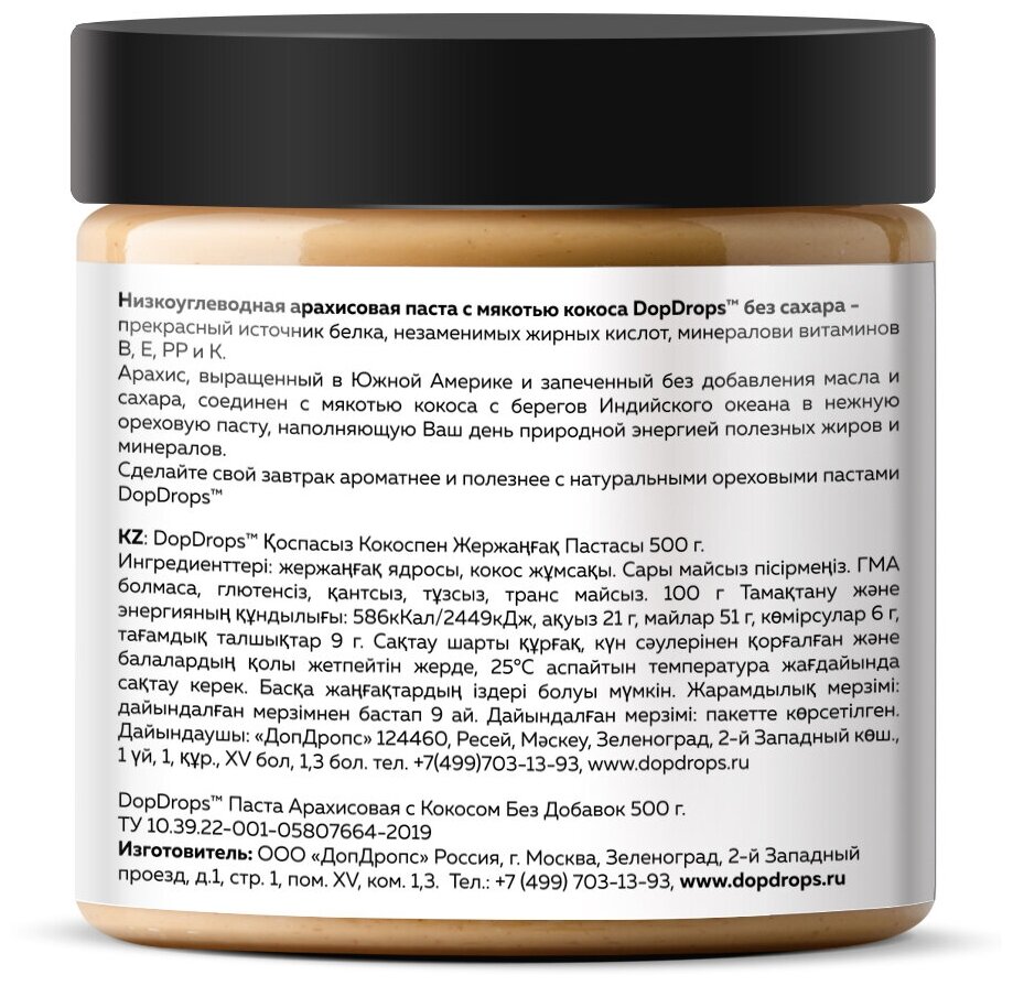 Паста Арахисовая DopDrops кокосовая (с кокосом) без добавок, 500 г информация: