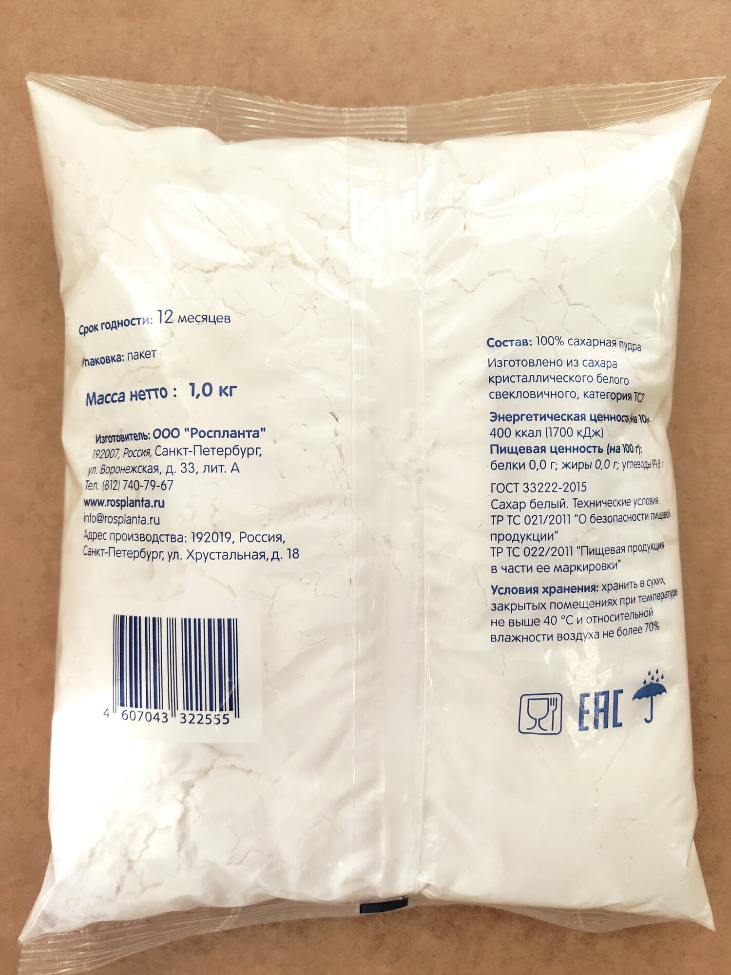 Сахарная пудра Роспланта мелкодисперсная ГОСТ 1кг информация: