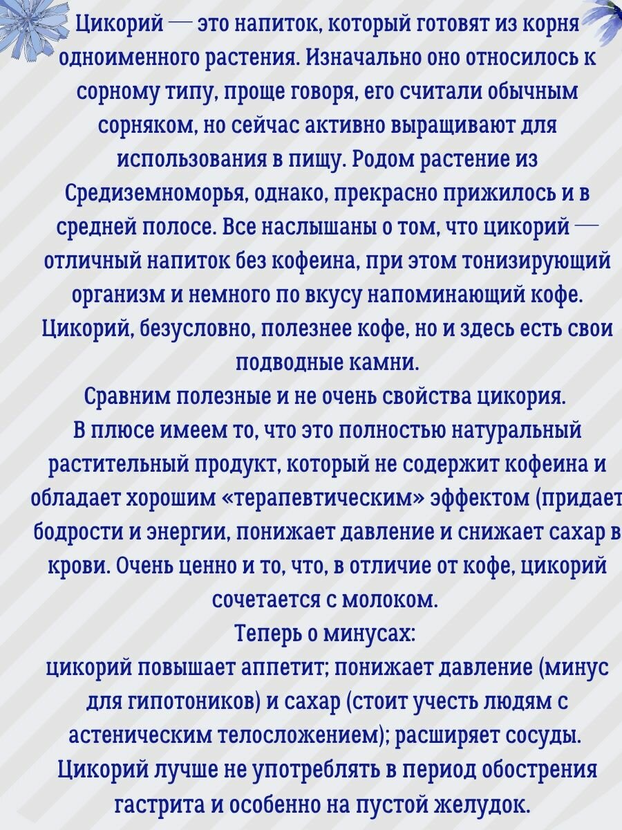 | Способ приготовления | положить 1-2 чайные ложки цикория в чашку. Залить кипятком и перемешать. Сахар, молоко или сливки добавлять по вкусу. |