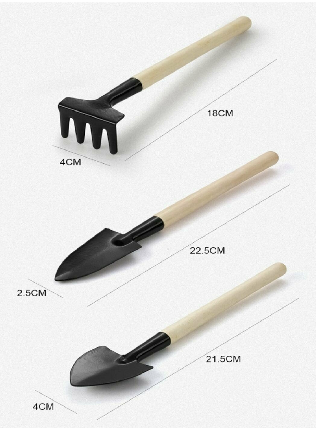 Набор садового инструмента, 3 предмета: грабли, 2 лопатки, длина 24 см, деревянные ручки