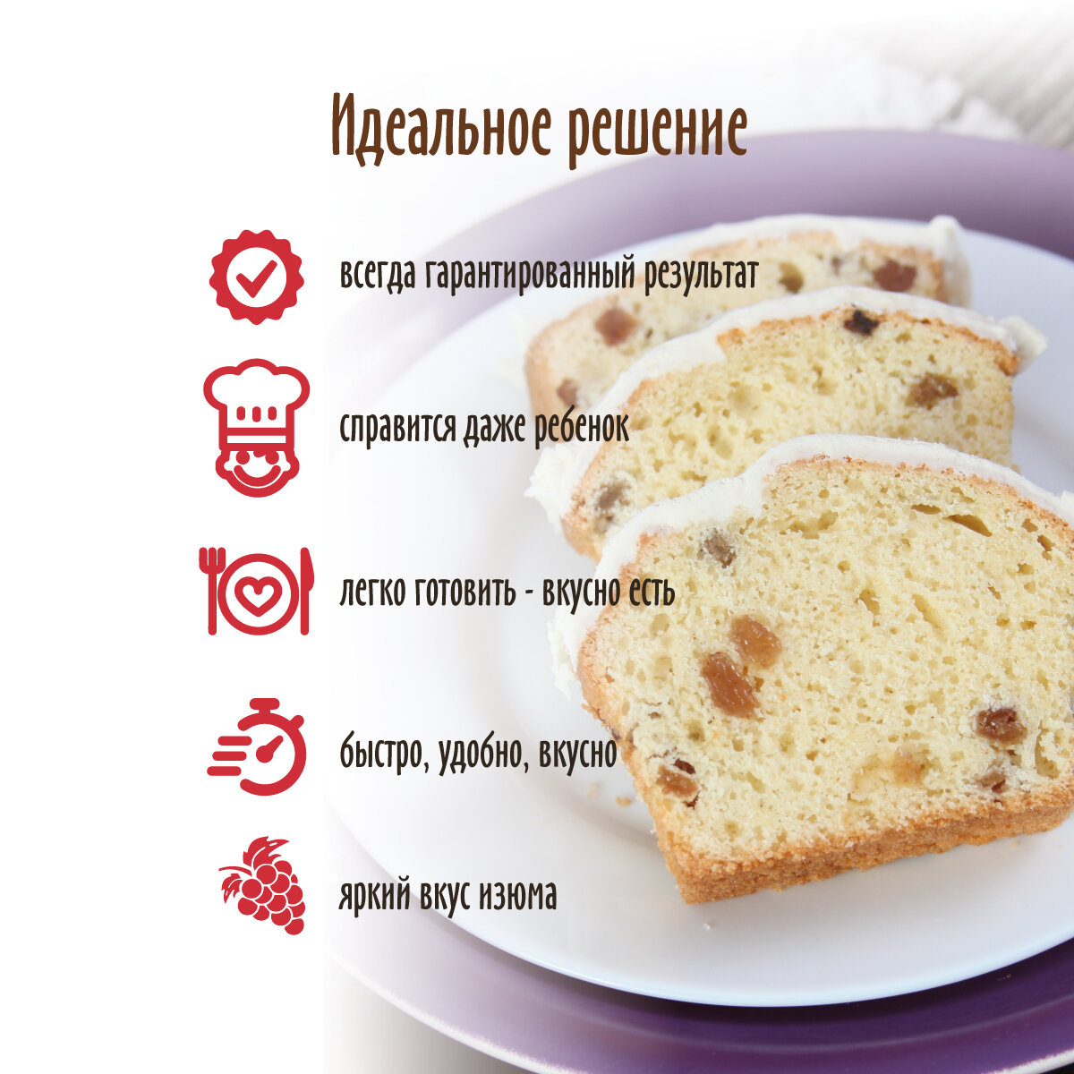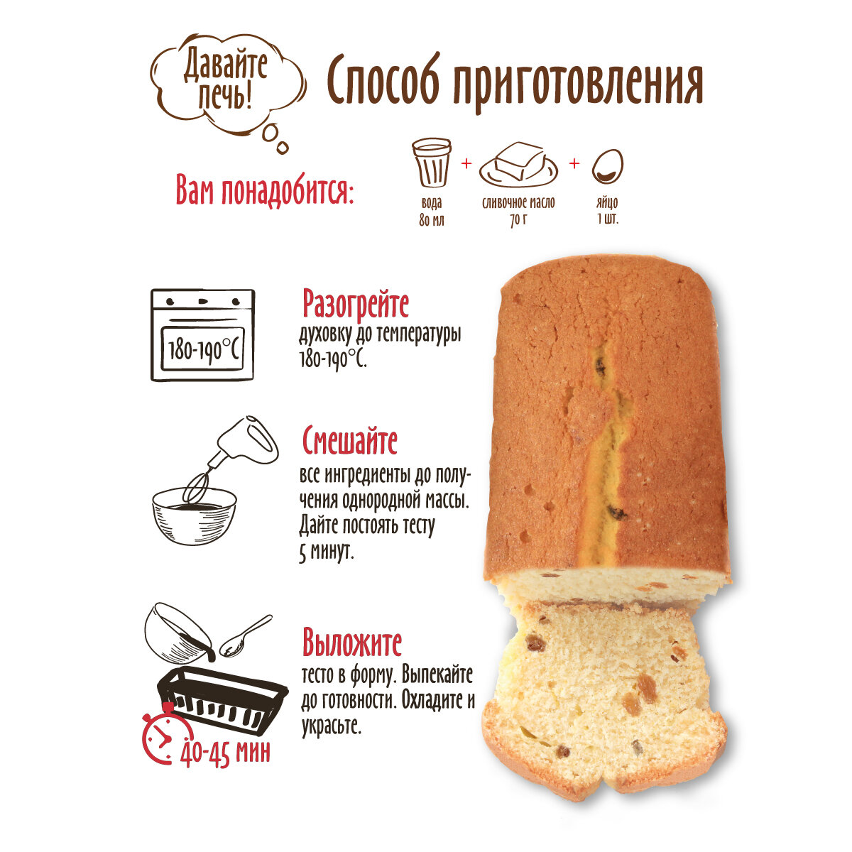 | Состав | мука пшеничная хлебопекарная высшего сорта, сахар белый, изюм, крахмал кукурузный, пищевая поваренная морская соль, пищевые добавки: эмульгатор Е471, разрыхлители теста (гидрокарбонат натрия - сода пищевая, пирофостат натрия), ароматизатор ванилин. |