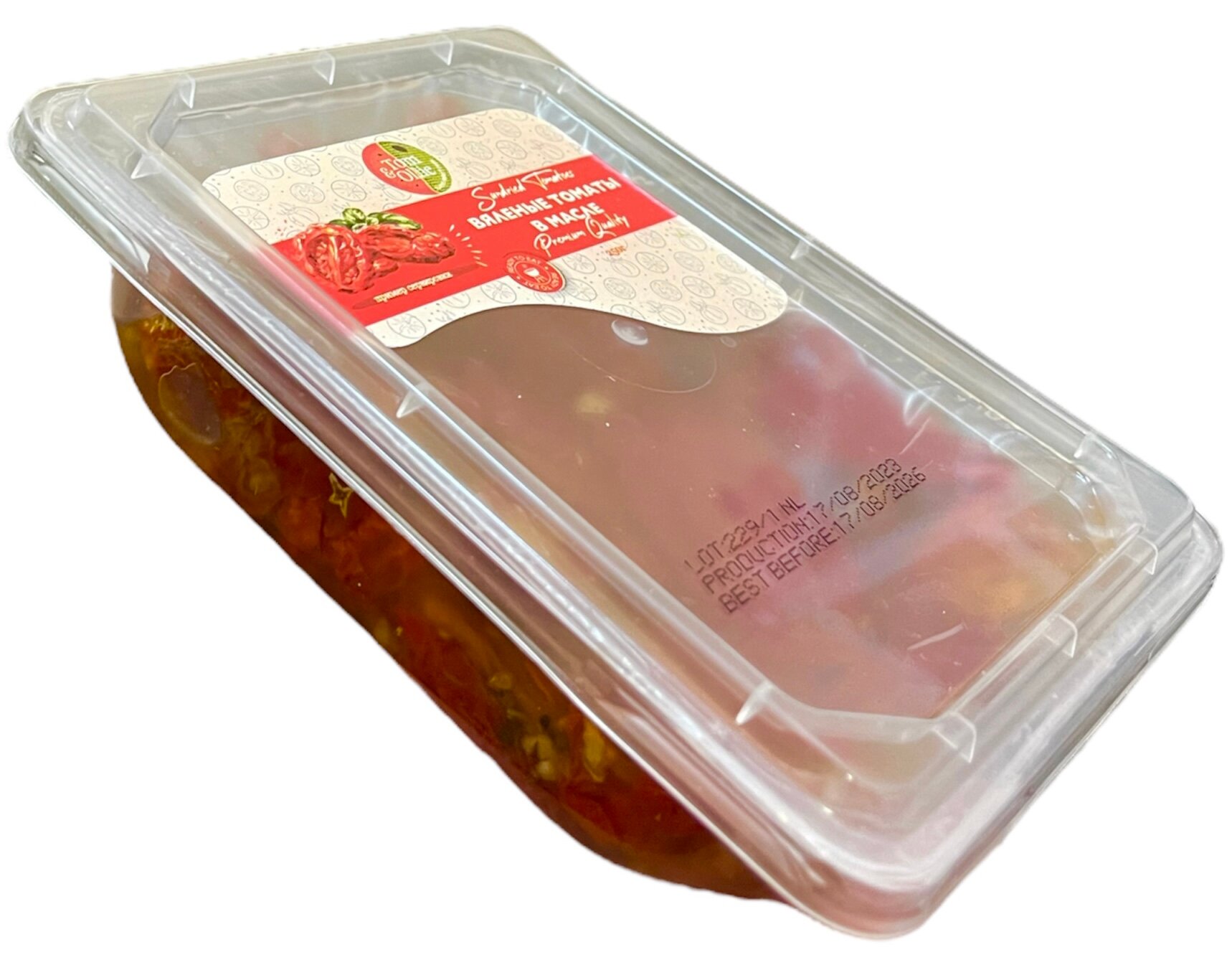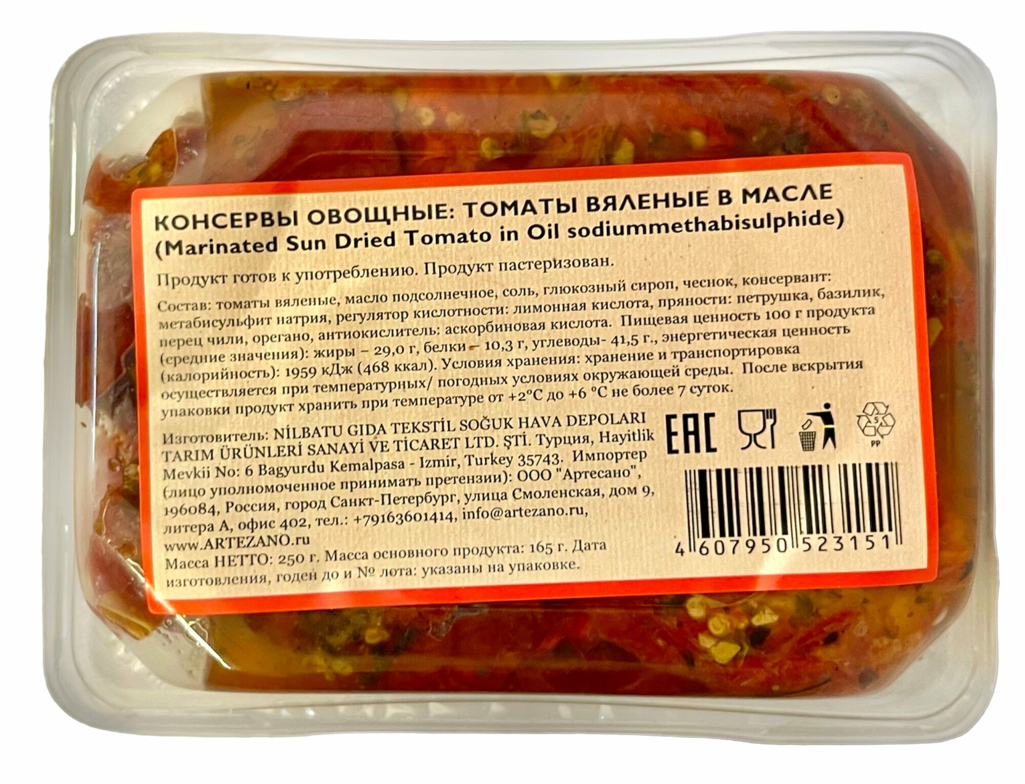 | Состав | томаты вяленые, масло подсолнечное, соль, глюкозный сироп, чеснок, консервант: метабисульфит натрия, регулятор кислотности: лимонная кислота, пряности: петрушка, базилик, перец чили, орегано, антиокислитель: аскорбиновая кислота. |