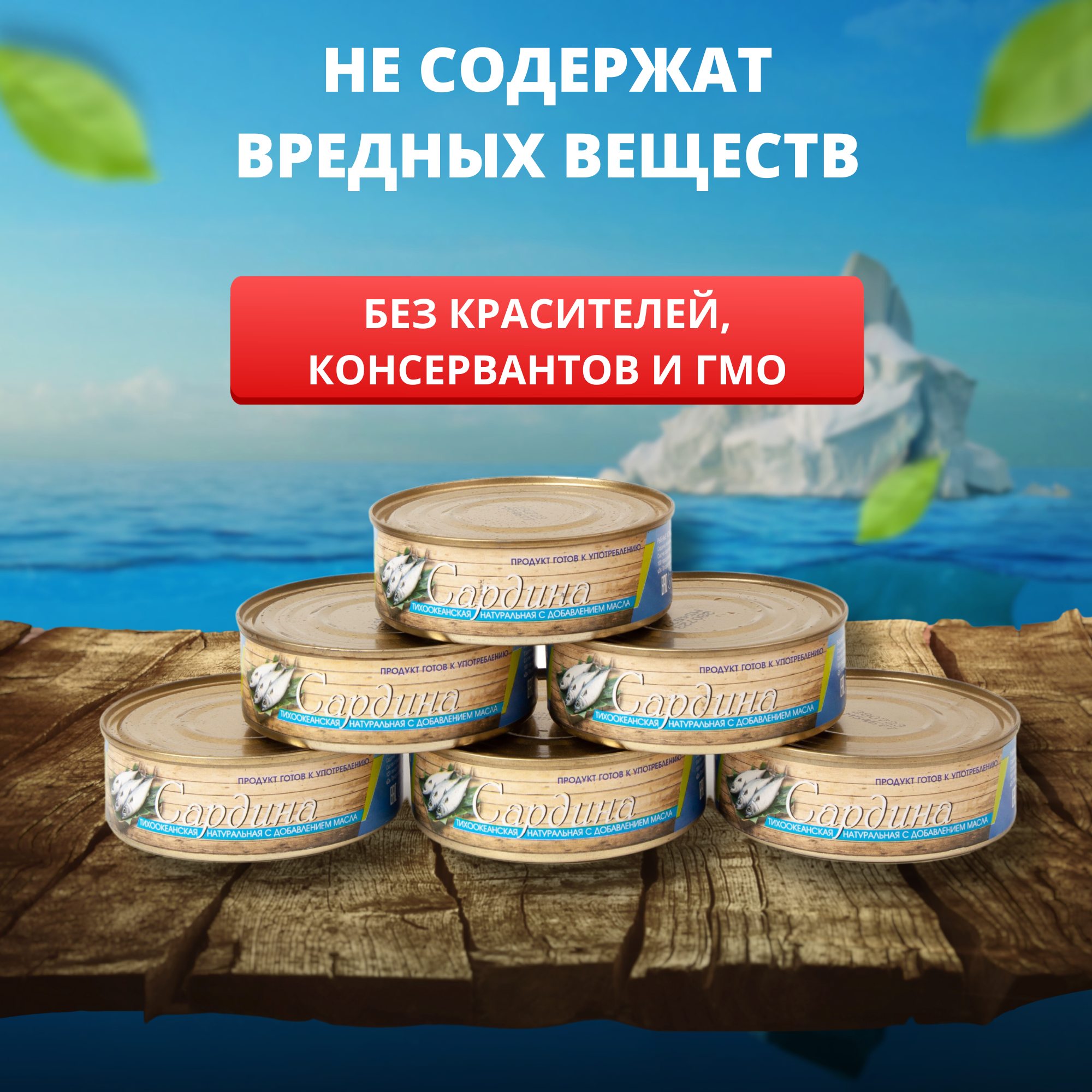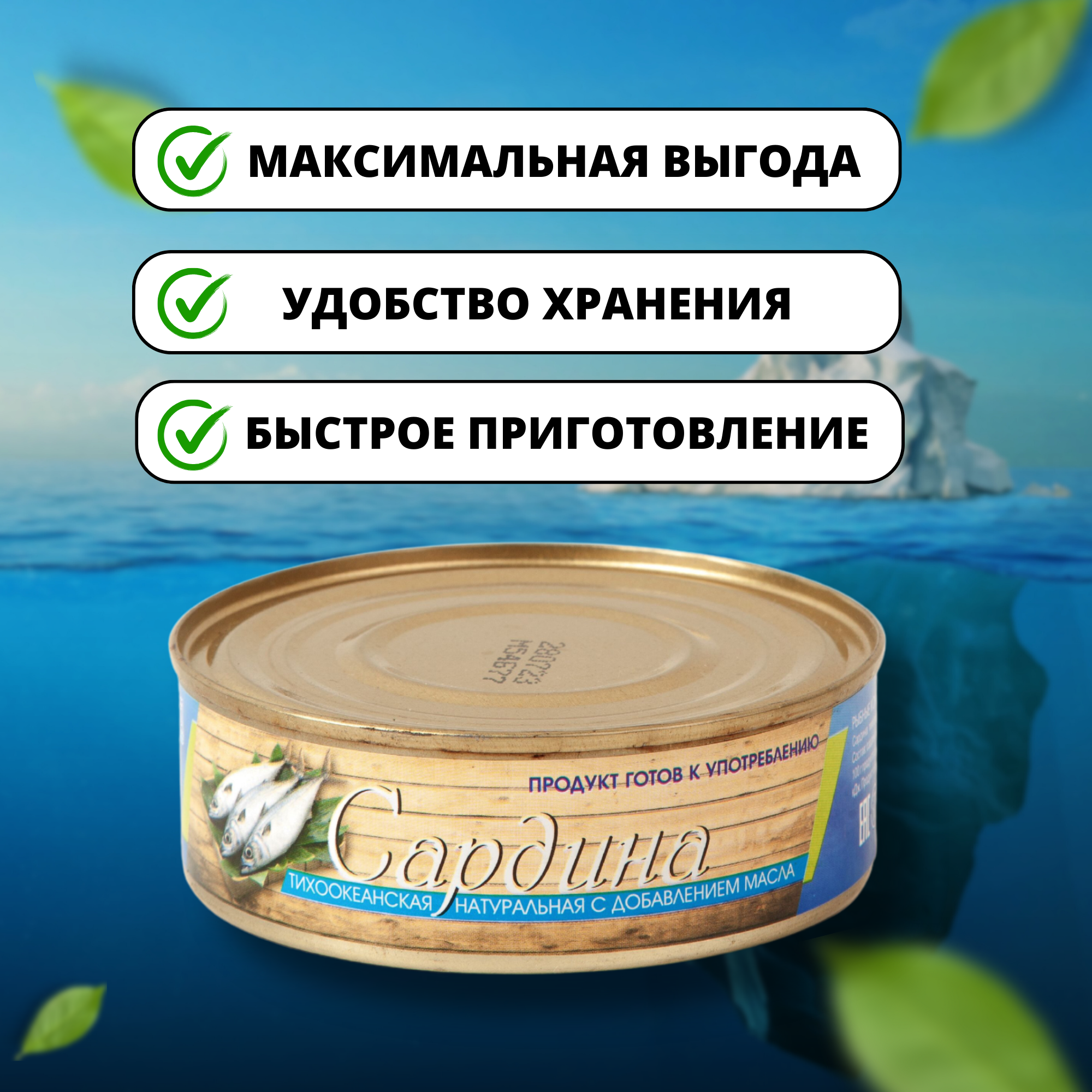 Сардина тихоокеанская натуральная с добавлением масла 6 банок по 240 грамм информация: