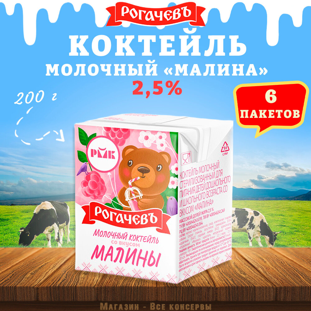 Молочный коктейль "Малина", 2,5%, Рогачев, 6 шт. по 200 г информация: