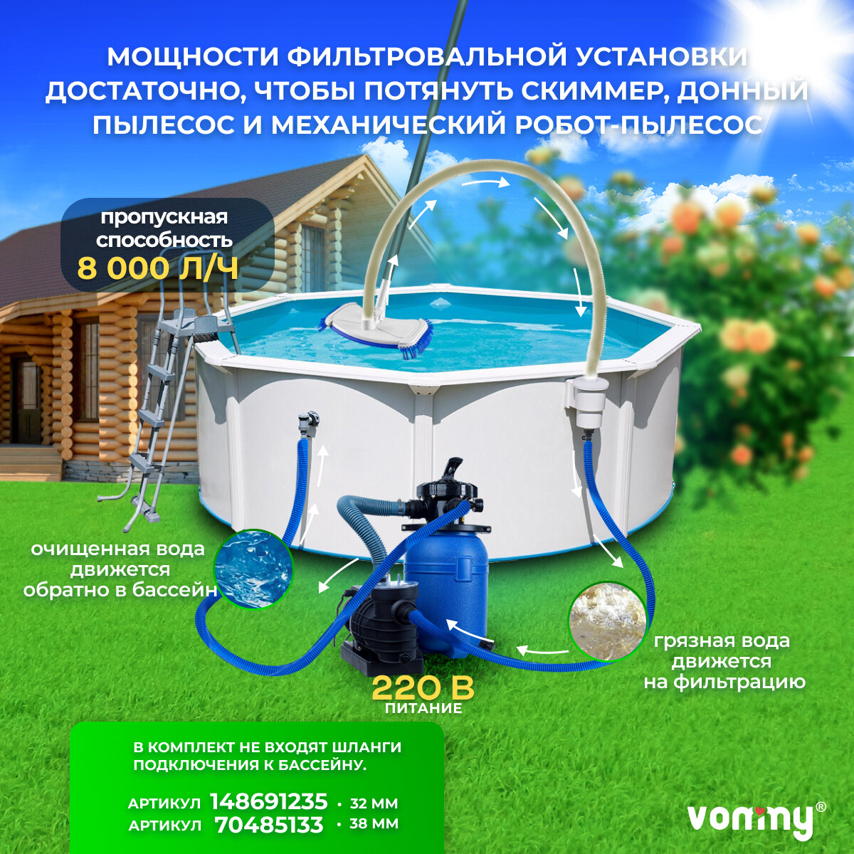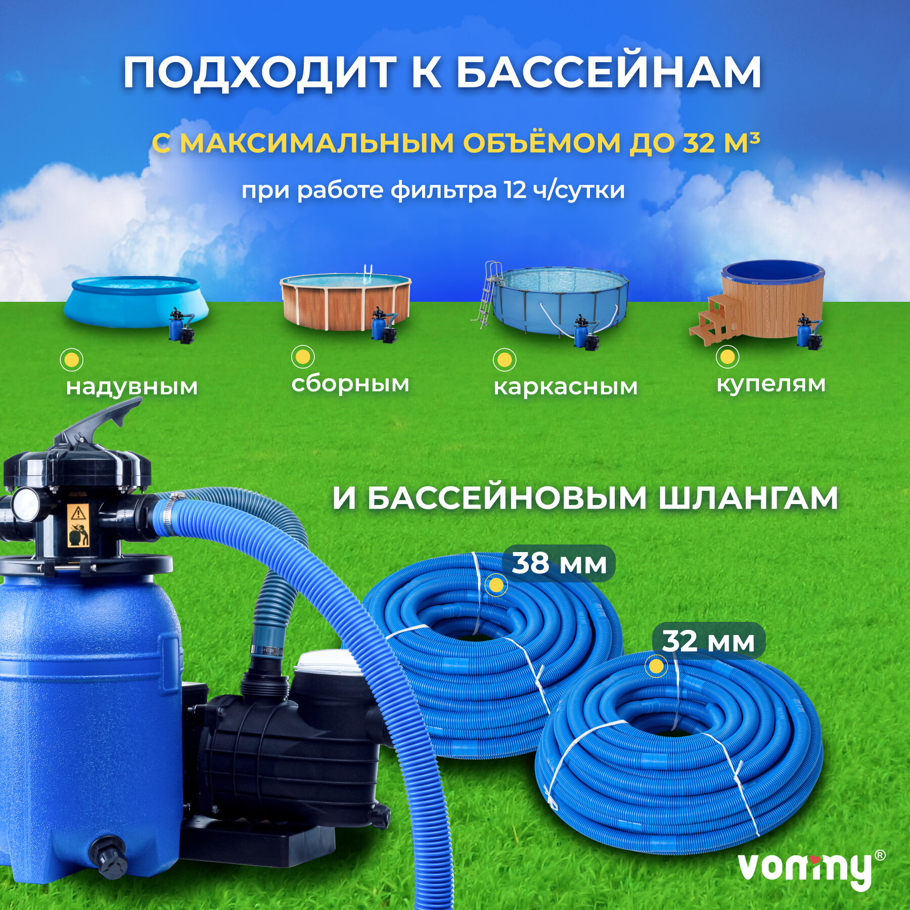 10 цен на Песочный фильтр-насос (песчаный) с таймером Vommy VM-5t - 6 куб. м/час для бассейна объемом до 25 куб. м - каркасных, надувных, сборных бассейнов