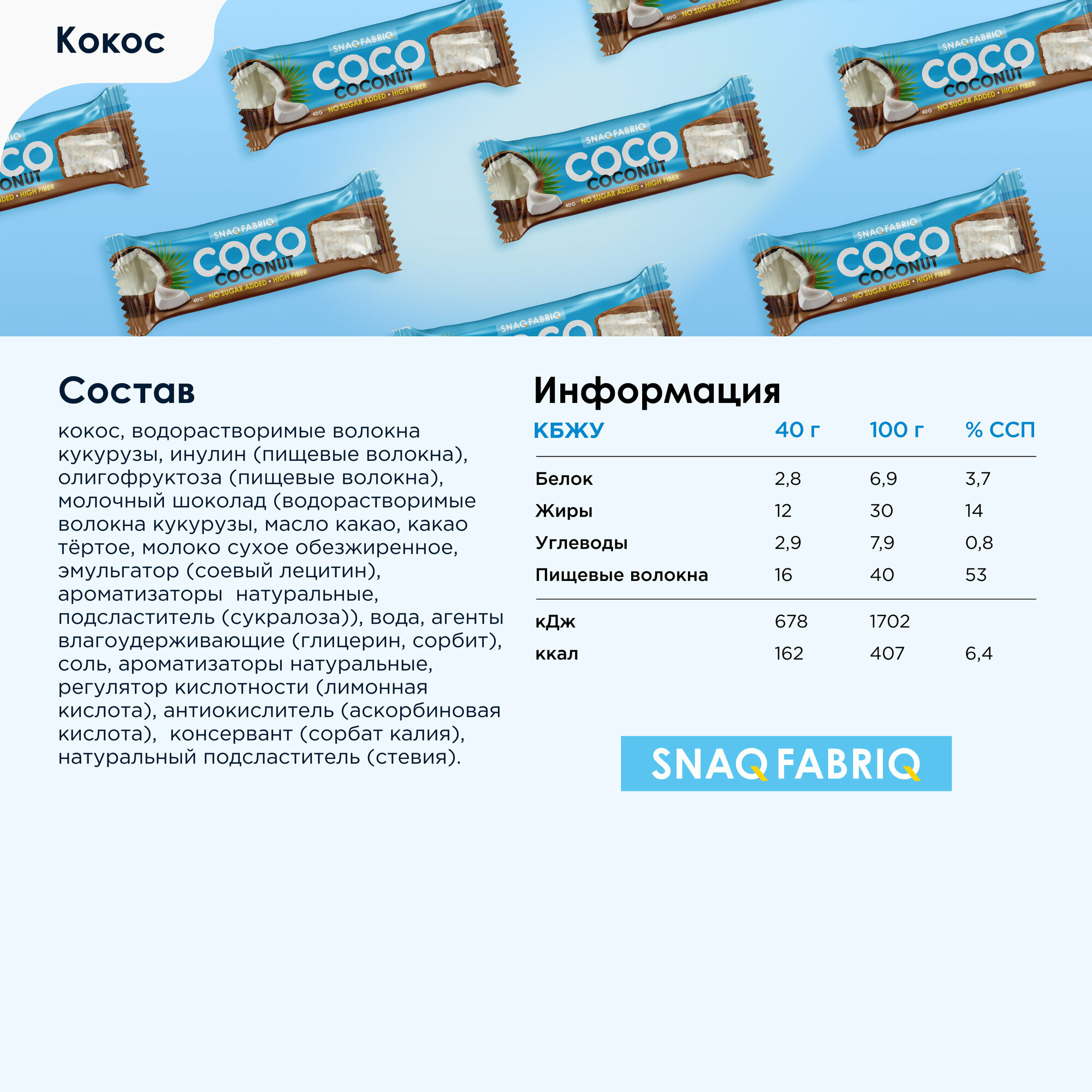Кокосовые батончики Snaq Fabriq сосо в шоколаде без сахара "Кокос", 12шт х 40г информация: