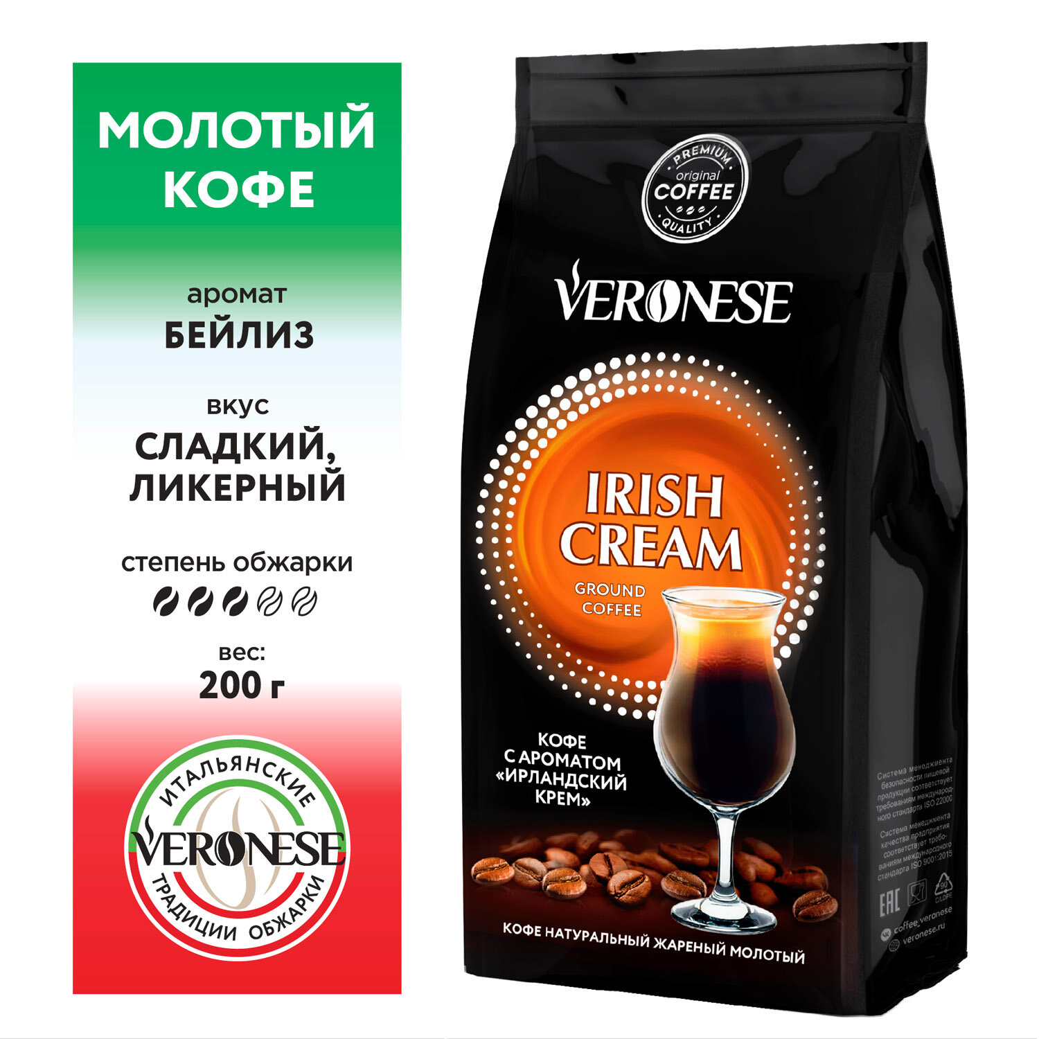 Кофе молотый Veronese с ароматом "IRISH CREAM" (Ирландские сливки), жареный, 200 гр. информация: