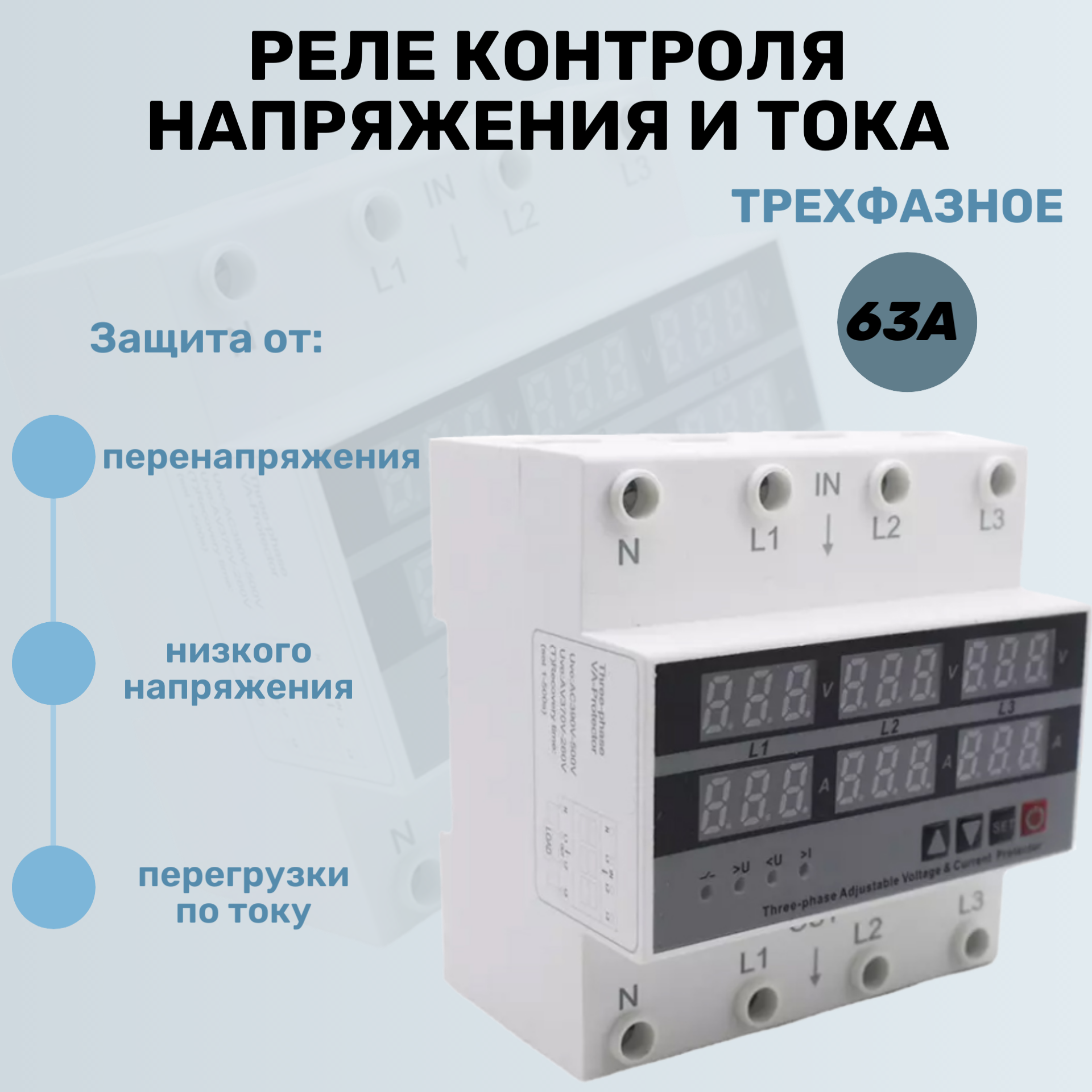 Реле контроля напряжения трехфазное с защитой от перегрузки по току 63А / Многофункциональное защитное устройство на DIN рейку информация: