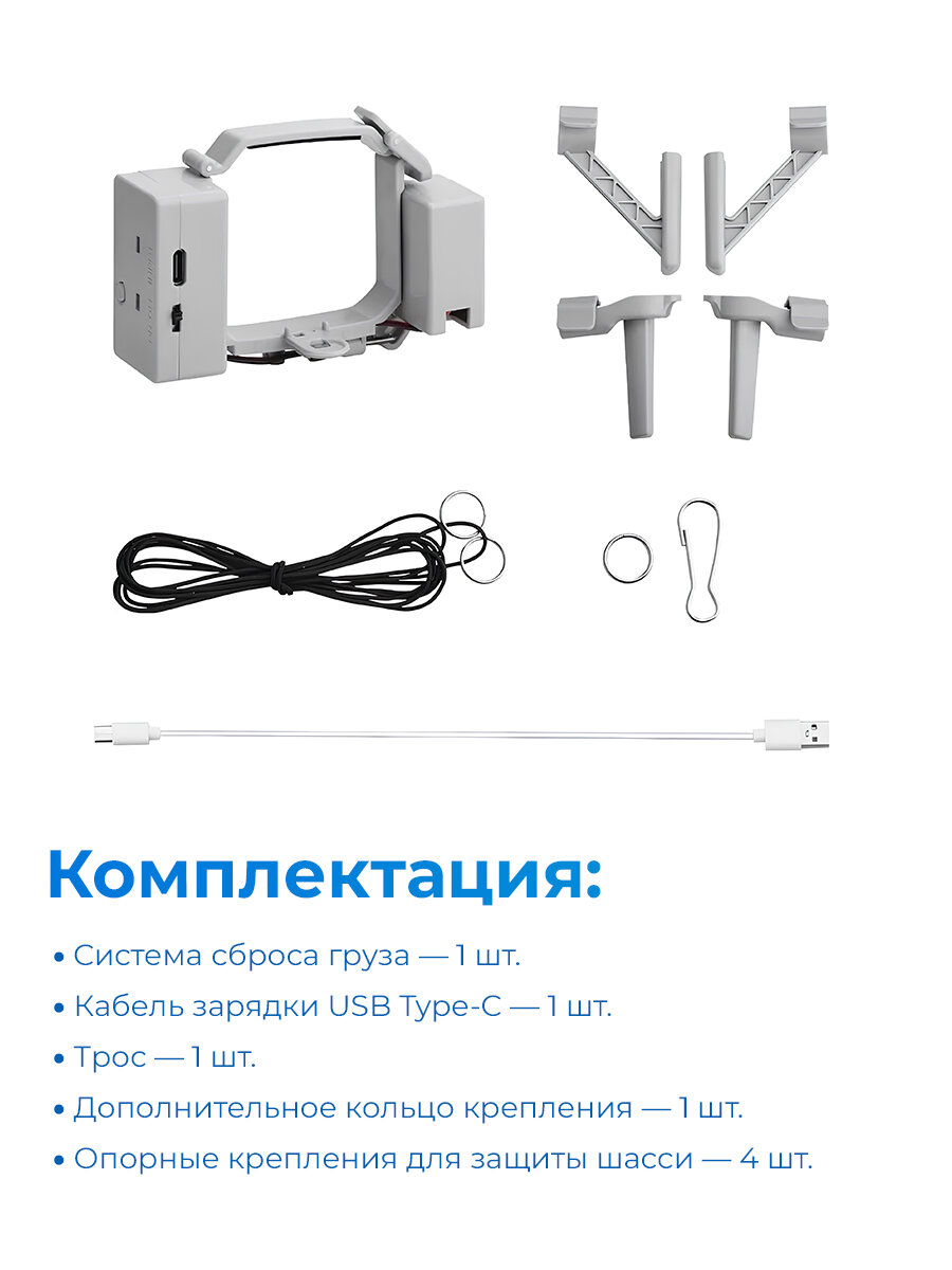 | Комплектация | система сброса - 1 шт. кабель зарядки USB Type-C-1 шт. Трос- 1 шт. Дополнительное кольцо крепления - 1 шт. Опорные крепления для защиты шасси - 4 шт. |
