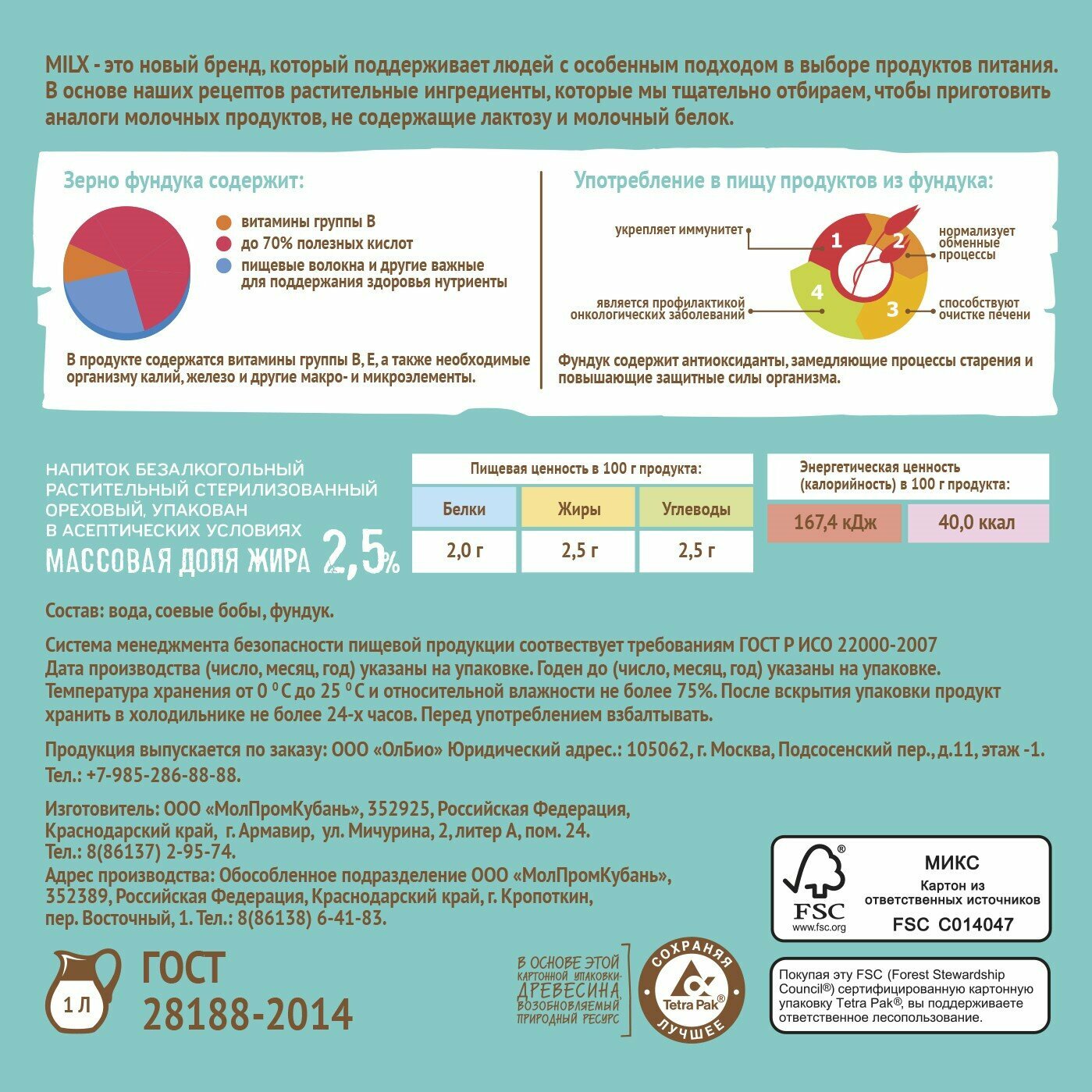 Растительное молоко из фундука, без сахара MILX 1,0л*3 шт информация: