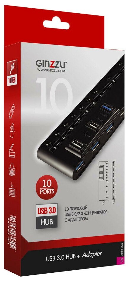 HUB GR-380UAB Ginzzu USB 3.0 10 port + adapter