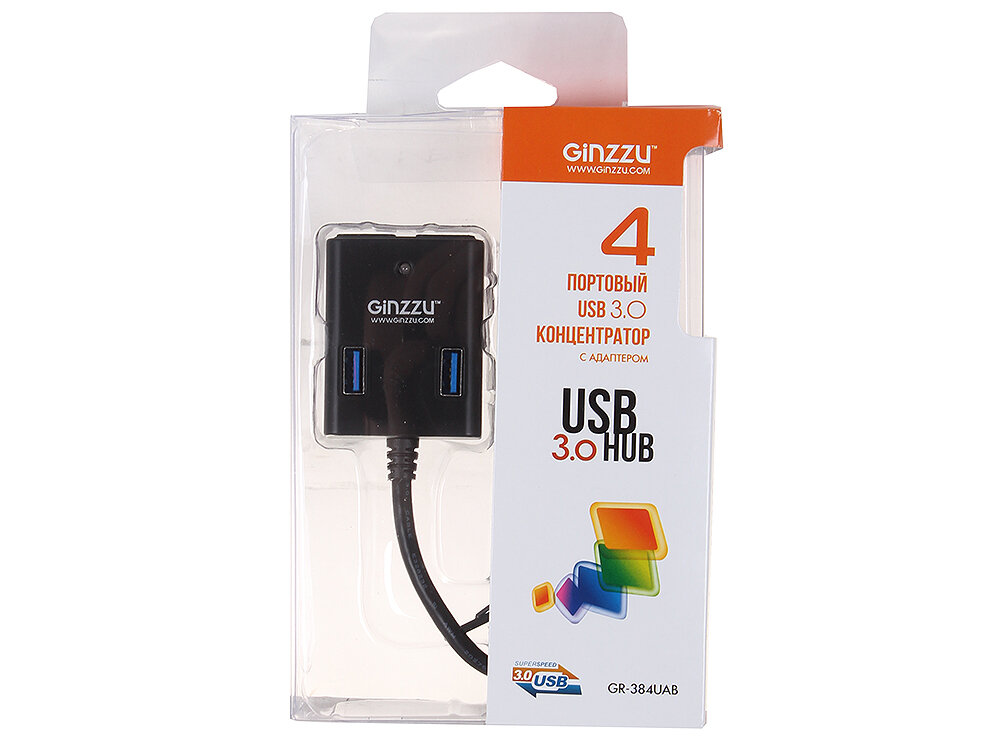 Разветвитель Ginzzu USB GR-384UAB (4 порта USB 3.0 + адаптер) черный