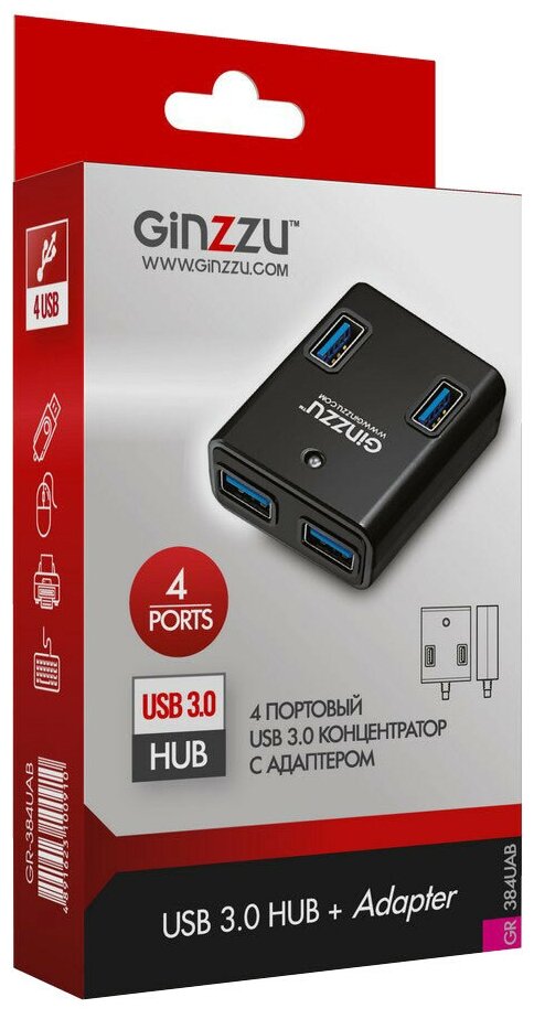 HUB GR-384UAB Ginzzu USB 3.0 4 port + adapter