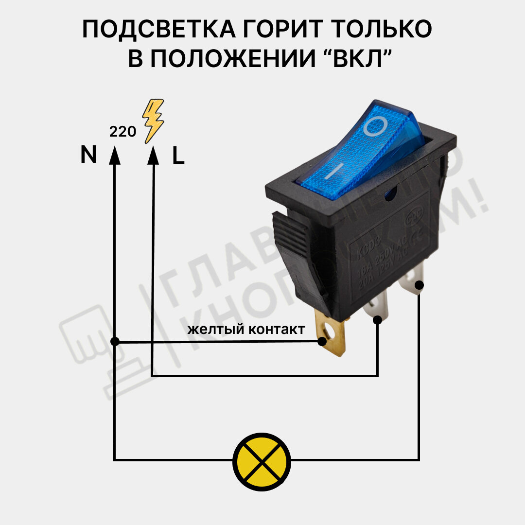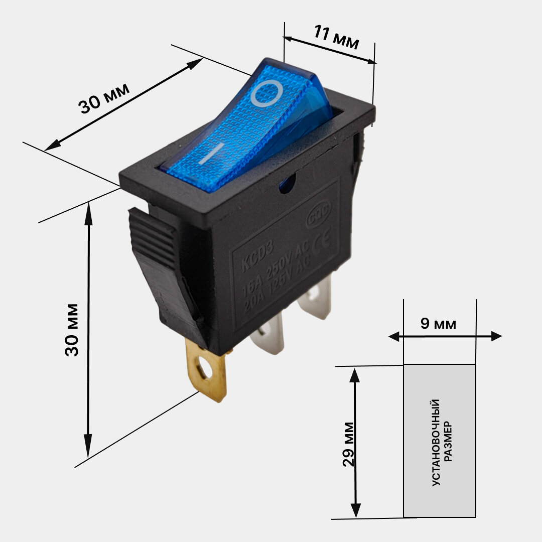 10 цен на Выключатель клавишный 250В 15А (3с) ON-OFF синий узкий с подсветкой KCD3 (+ клеммы и термоусадка)