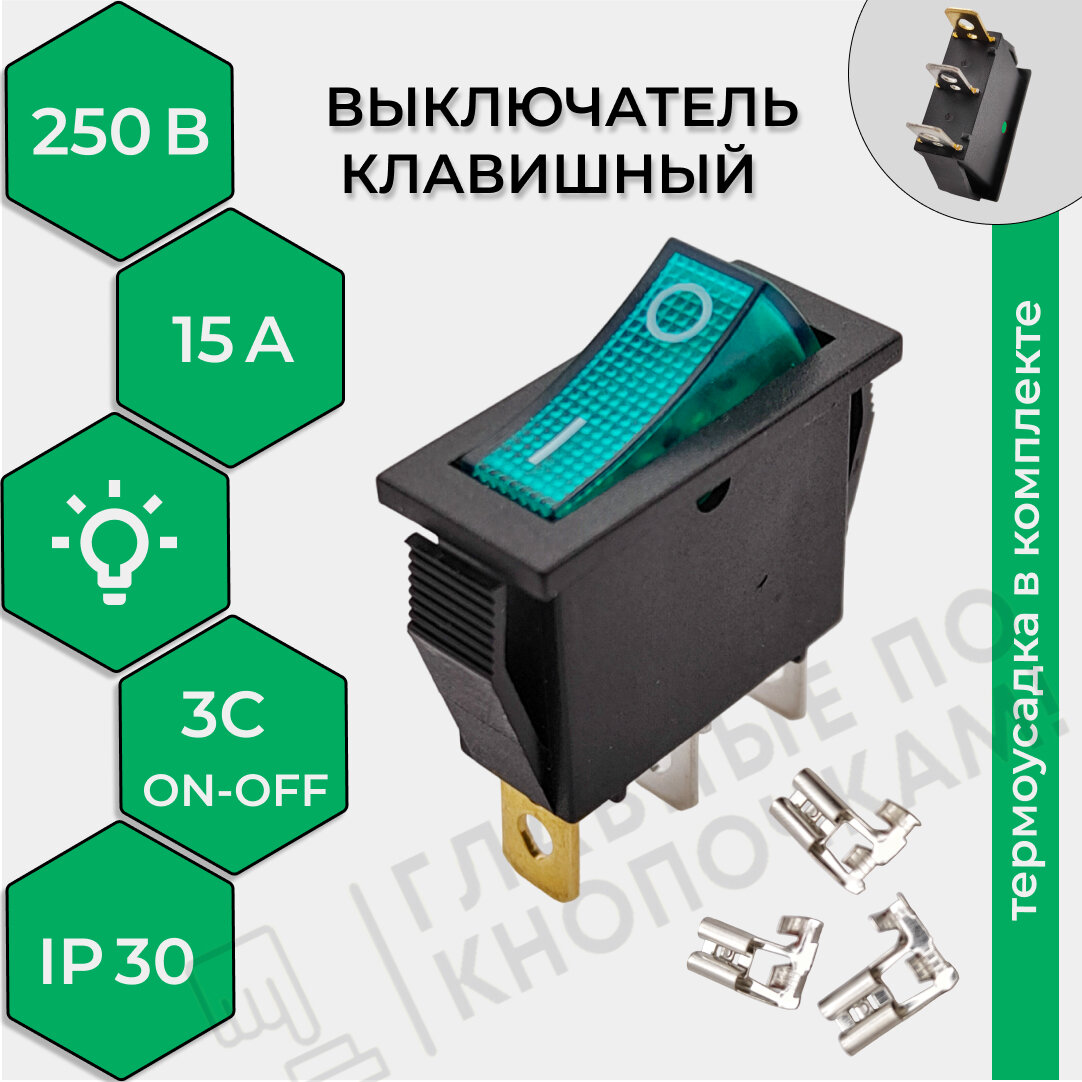 Выключатель клавишный 250В 15А (3с) ON-OFF зеленый узкий с подсветкой KCD3 (+ клеммы и термоусадка) информация: