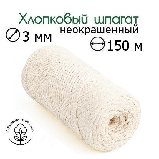 10 цен на Шпагат хлопковый 3 мм 150 м неокрашенный для макраме, вязания, рукоделия