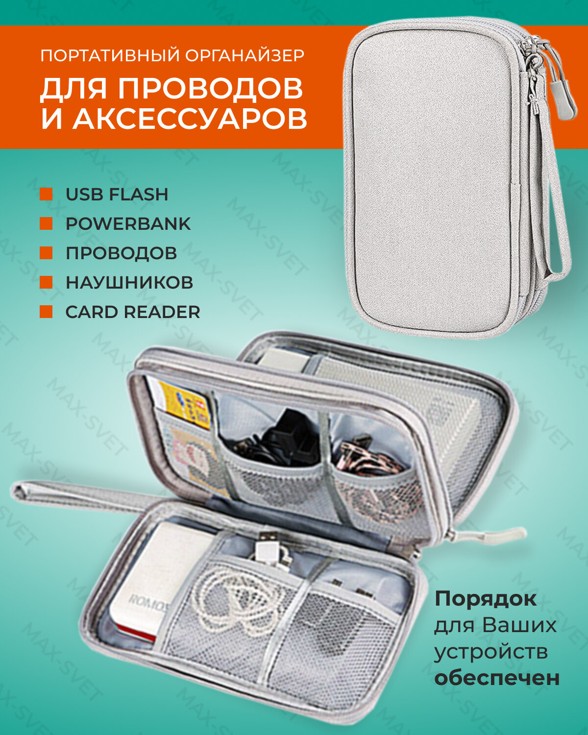 Сумка органайзер для проводов, зарядок, аксессуаров, цвет бело-серый (MAXSVETSHOP) 949 ₽