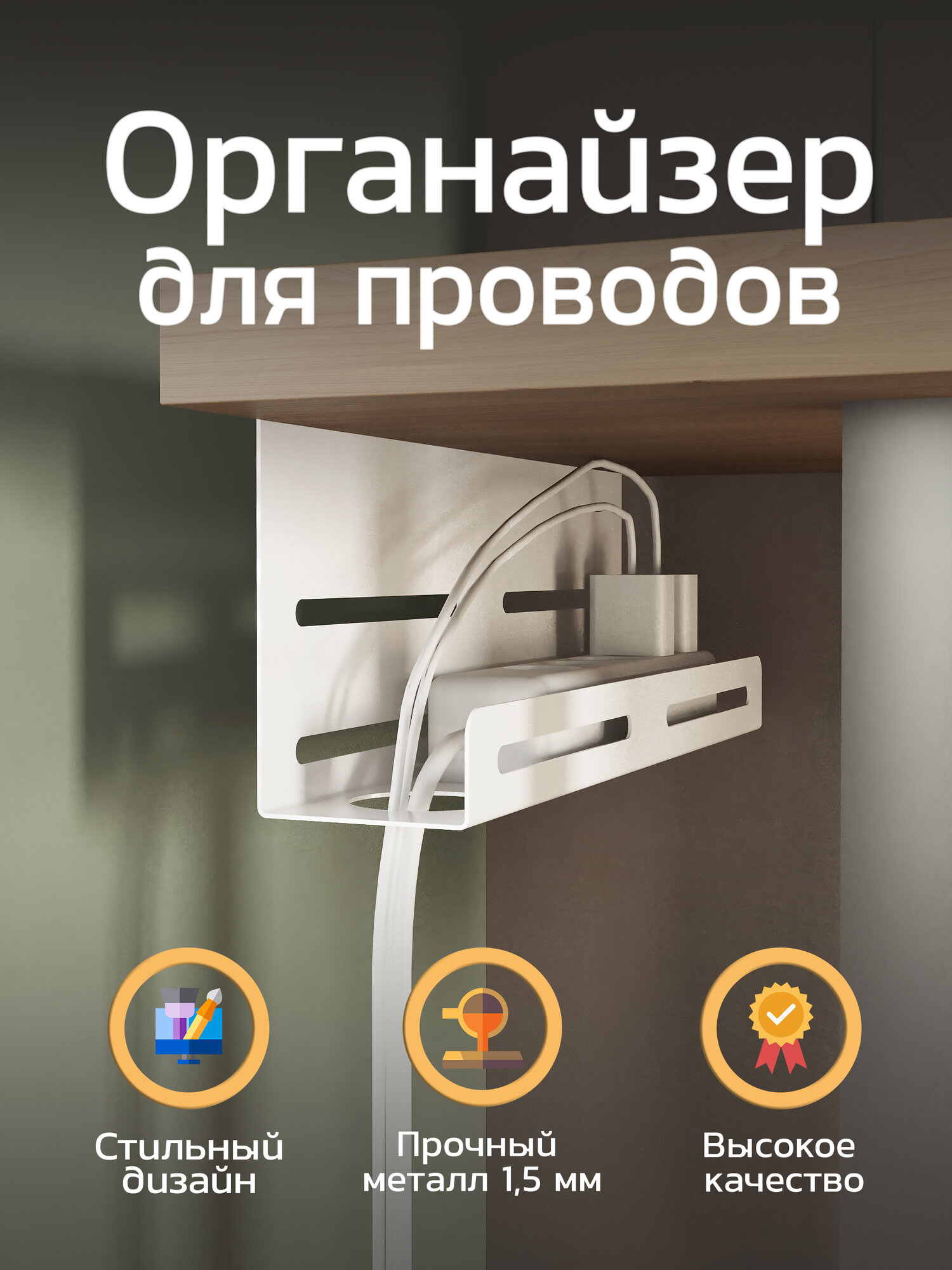 Отзывы на Подвесной настольный органайзер для проводов, кабелей, зарядок с держателем сетевого фильтра или удлинителя TEMPACHE, 40х18х8 см, белый
