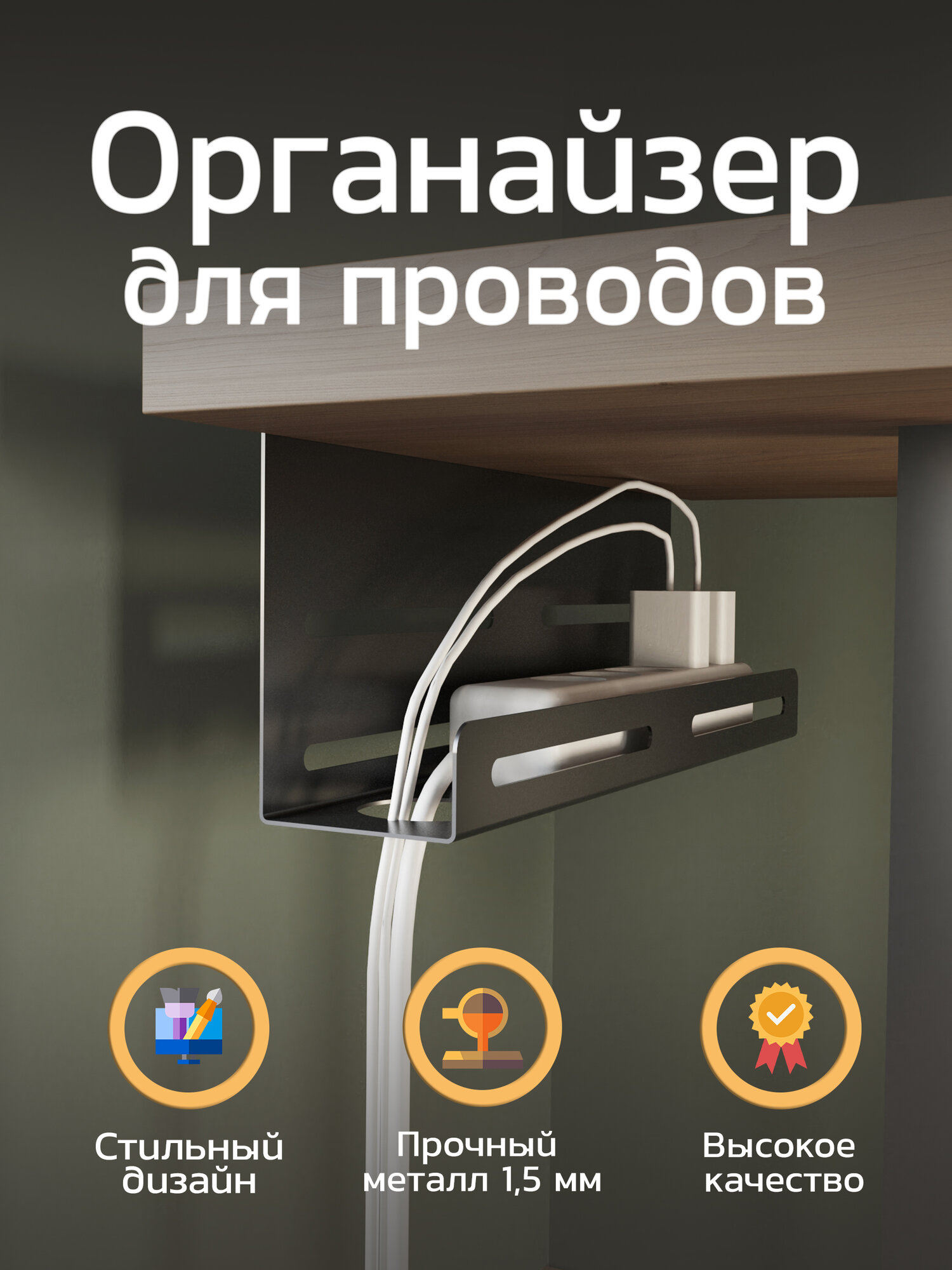 Отзывы на Подвесной настольный органайзер для проводов, кабелей, зарядок с держателем сетевого фильтра или удлинителя TEMPACHE, 40х18х8 см, черный