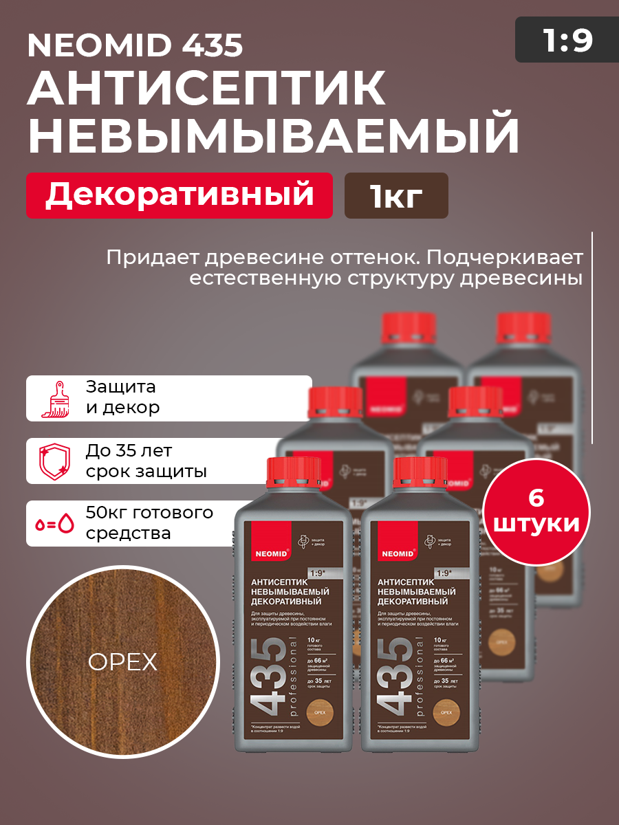 Антисептик-консервант Neomid 435 финишный невымываемый концентрат, цвет орех, комплект 6 штук по 1 кг 9 250 ₽