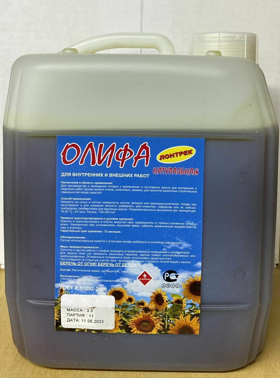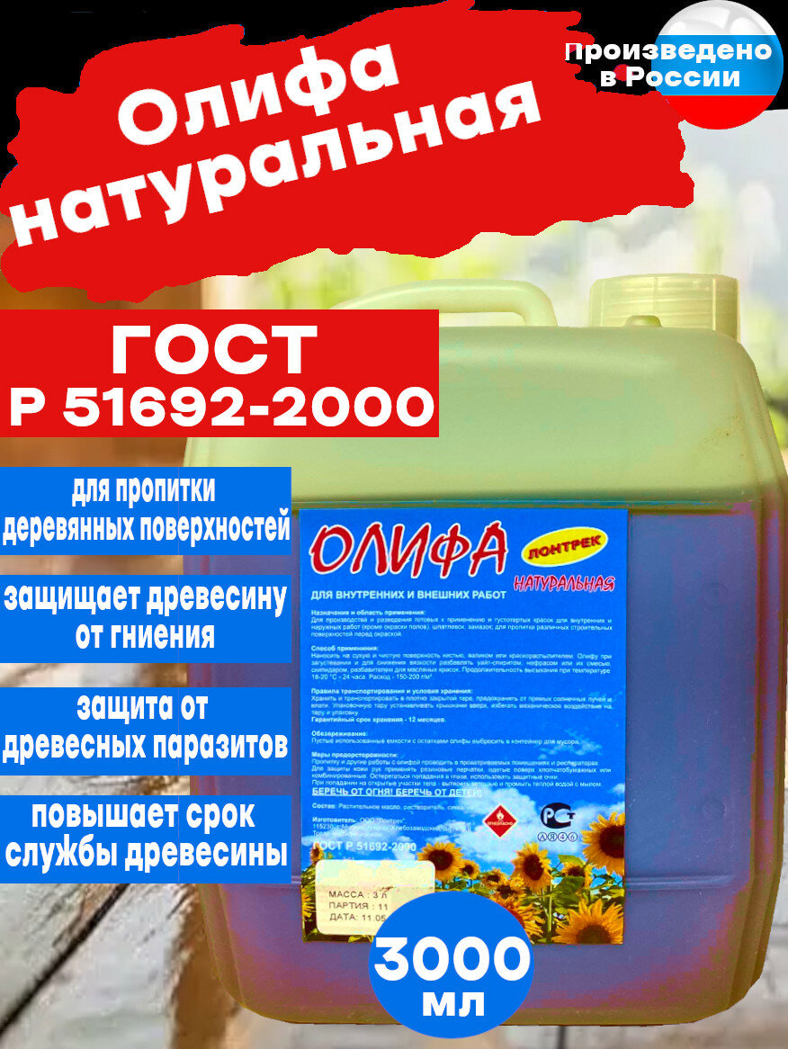 Олифа натуральная , ГОСТ Р 51692-2000, 3 л, Лонтрек информация: