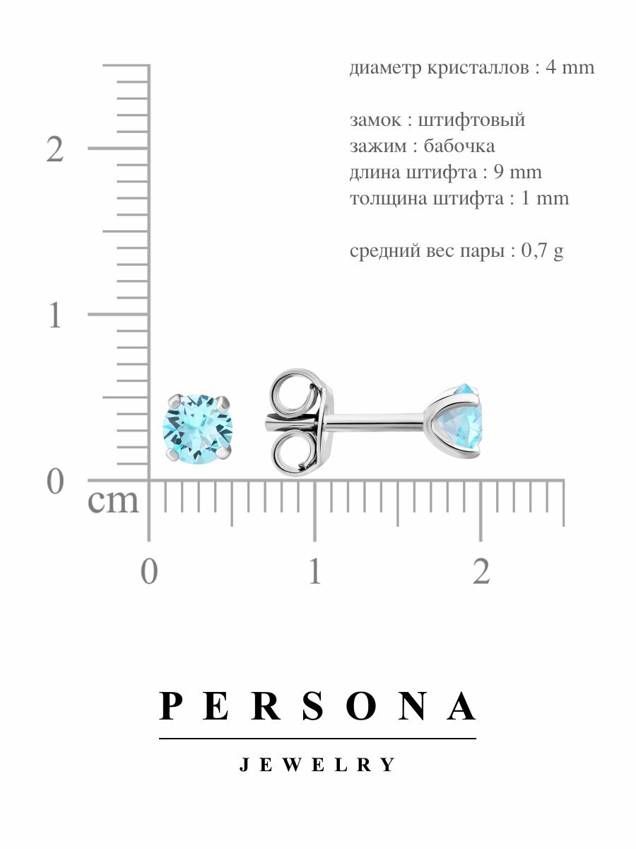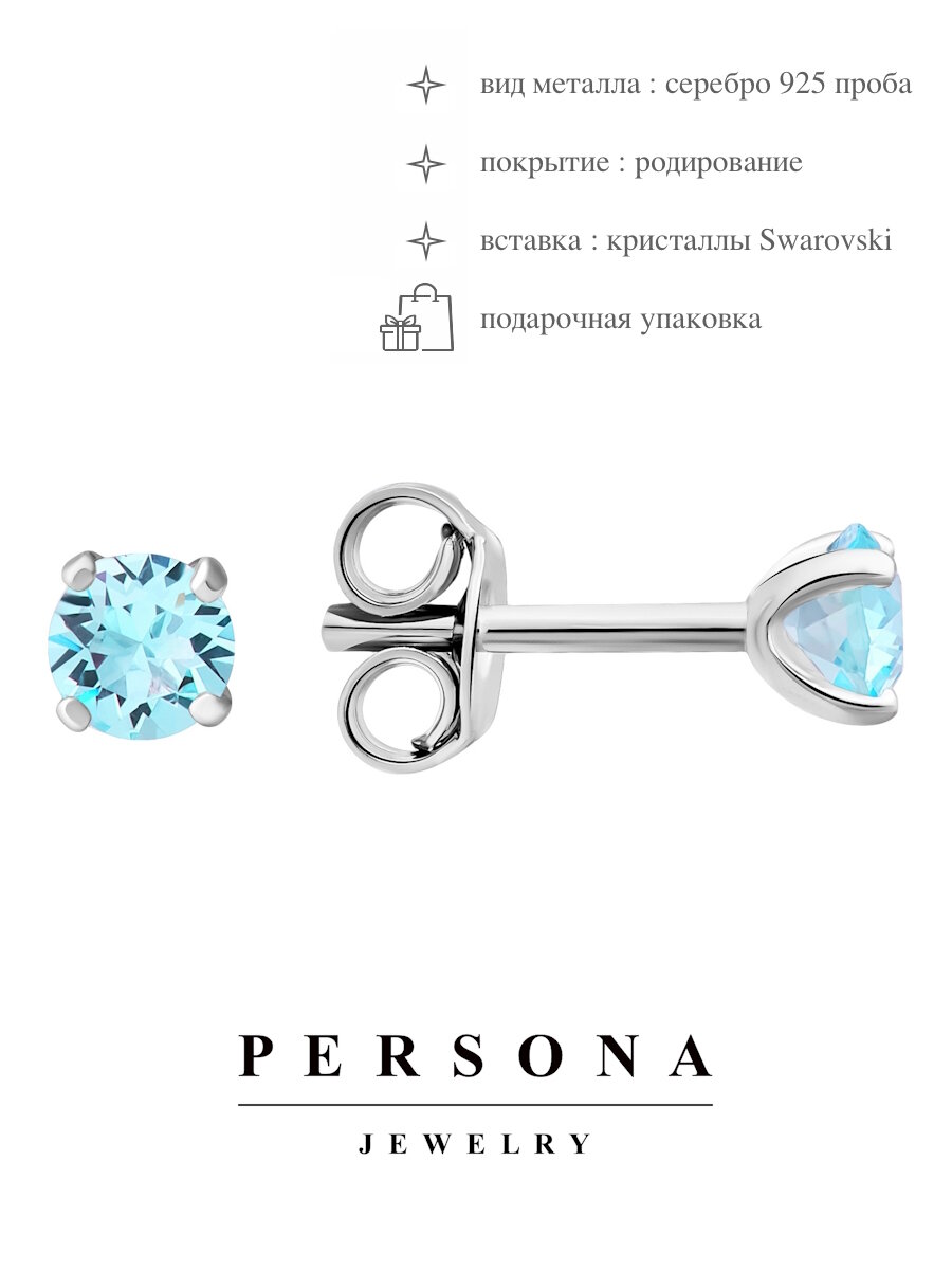 Серьги пусеты ПЕРСОНА, серебро, 925 проба, родирование, кристаллы Swarovski, размер 4 мм, длина 1.3 см, , синий 1 444 ₽
