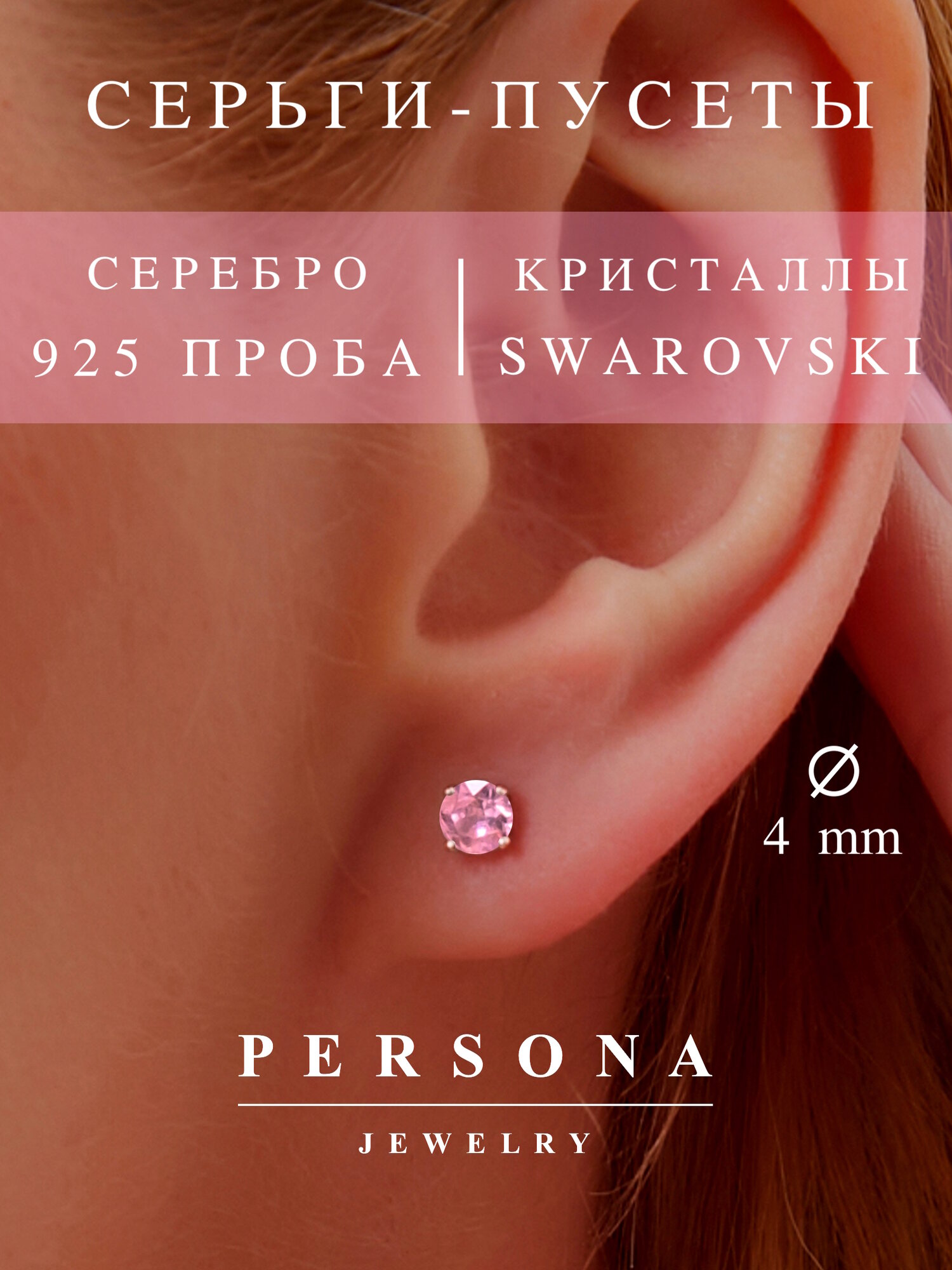 Серьги пусеты ПЕРСОНА, серебро, 925 проба, родирование, кристаллы Swarovski, размер 4 мм, длина 1.3 см, , розовый 1 550 ₽