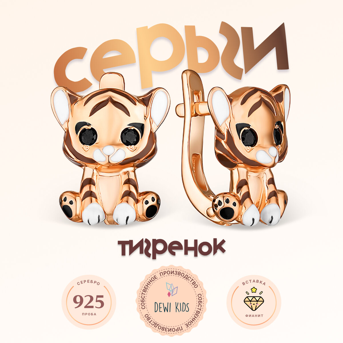 Отзывы на Детские серьги "Тигренок" из серебра 925 пробы с позолотой и эмалью, DEWI KIDS.