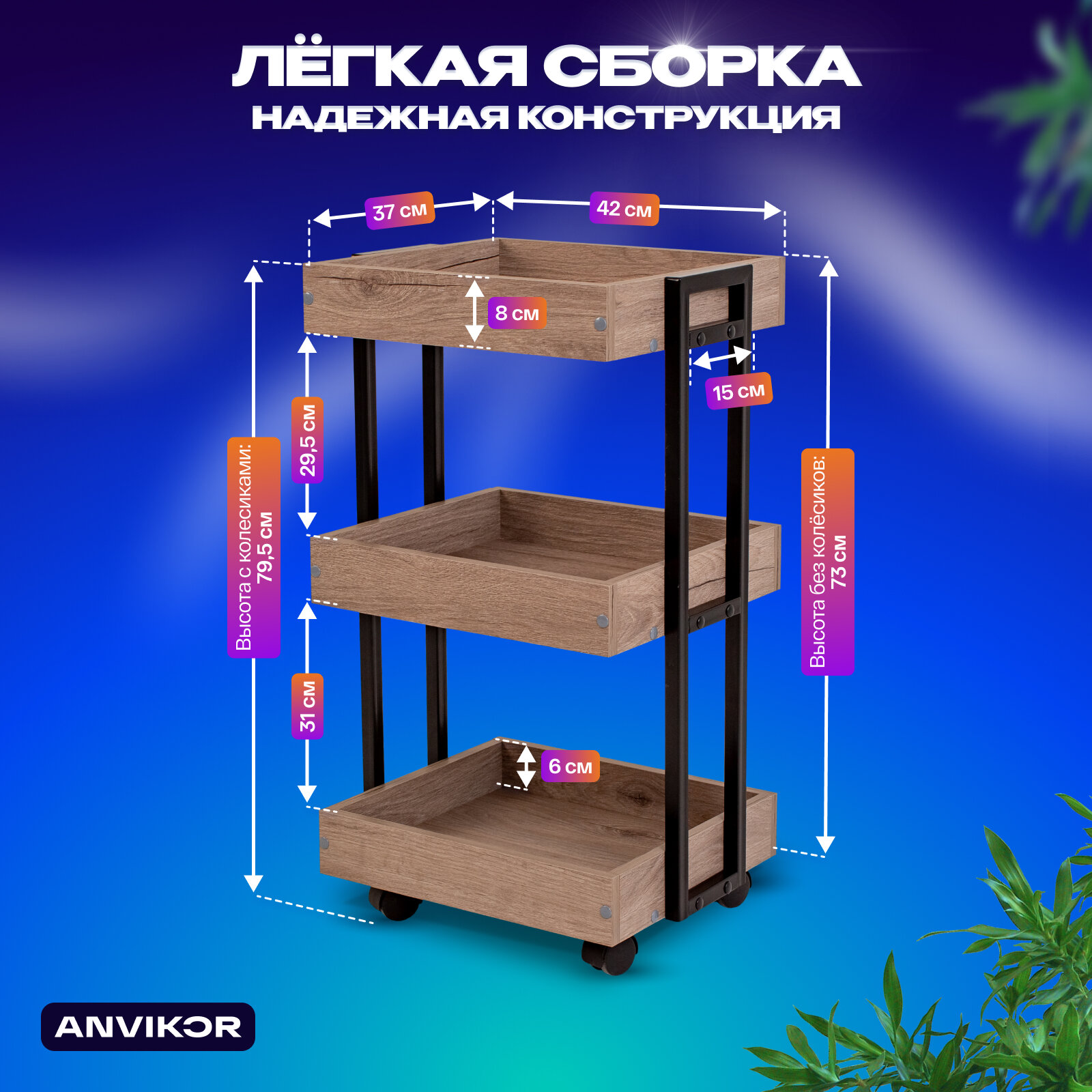 Тележка косметологическая трехъярусная с бортиками на колесиках лофт Ангара коричневая 4 849 ₽