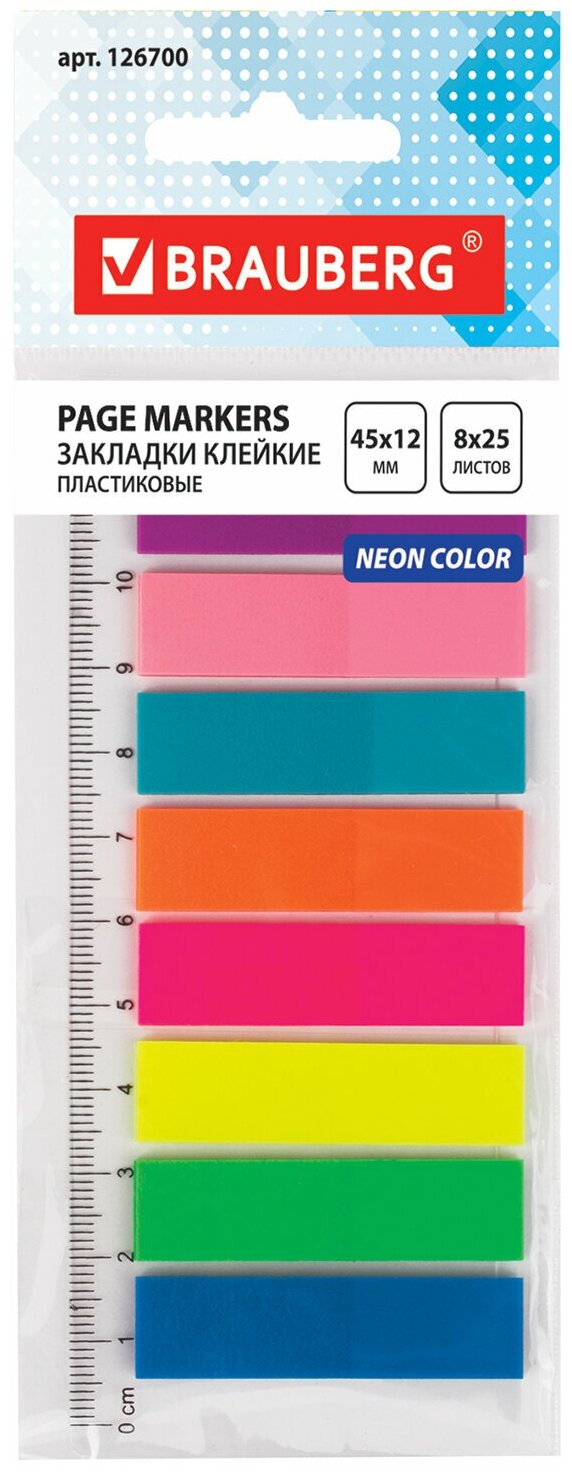 Закладки клейкие BRAUBERG неоновые пластиковые, 45х12 мм, 8 цветов х 25 листов, на пластиковой линейке 12 см, 126700 - 1 шт.