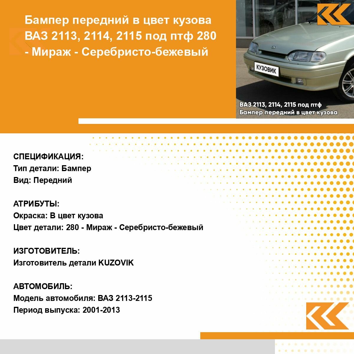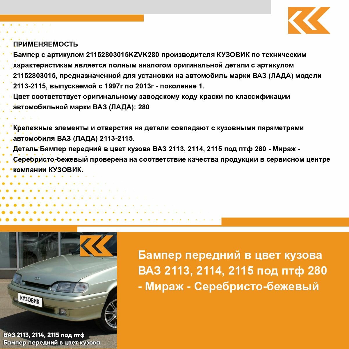 | Подробная комплектация | Бампер передний в цвет кузова ВАЗ 2114 2115 |