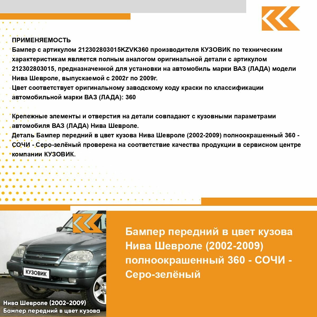 | Подробная комплектация | Бампер передний в цвет кузова для Нива Шевроле (2002-2009) полноокрашенный |