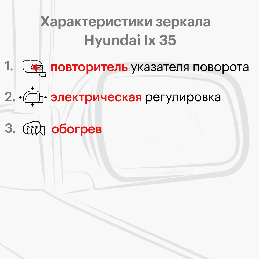 | Дополнительная информация | Зеркало правое под покраску, с обогревом, с повторителем, с эл. регулировкой Hyundai Ix35 (2010-2015) |