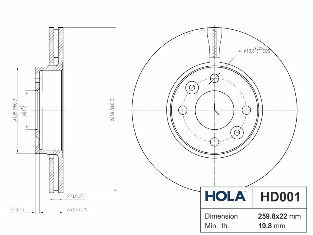 Диск тормозной ВАЗ-Largus, Vesta, X-RAY с АБС d-260 мм, HOLA HD001 информация:
