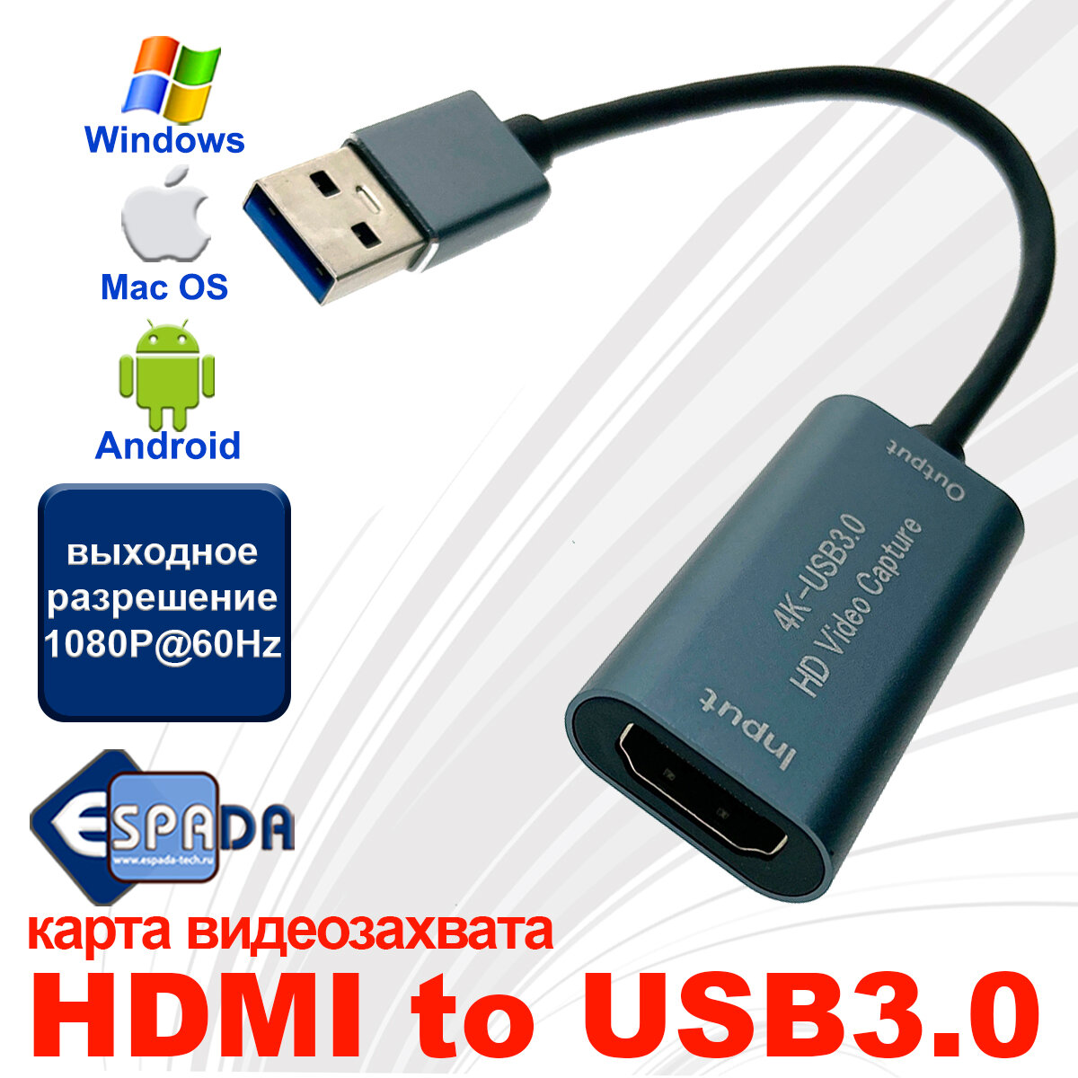Карта видеозахвата HDMI to USB3.0, 1080P@60Hz чипсет MS2130, модель EVihu3, Espada информация: