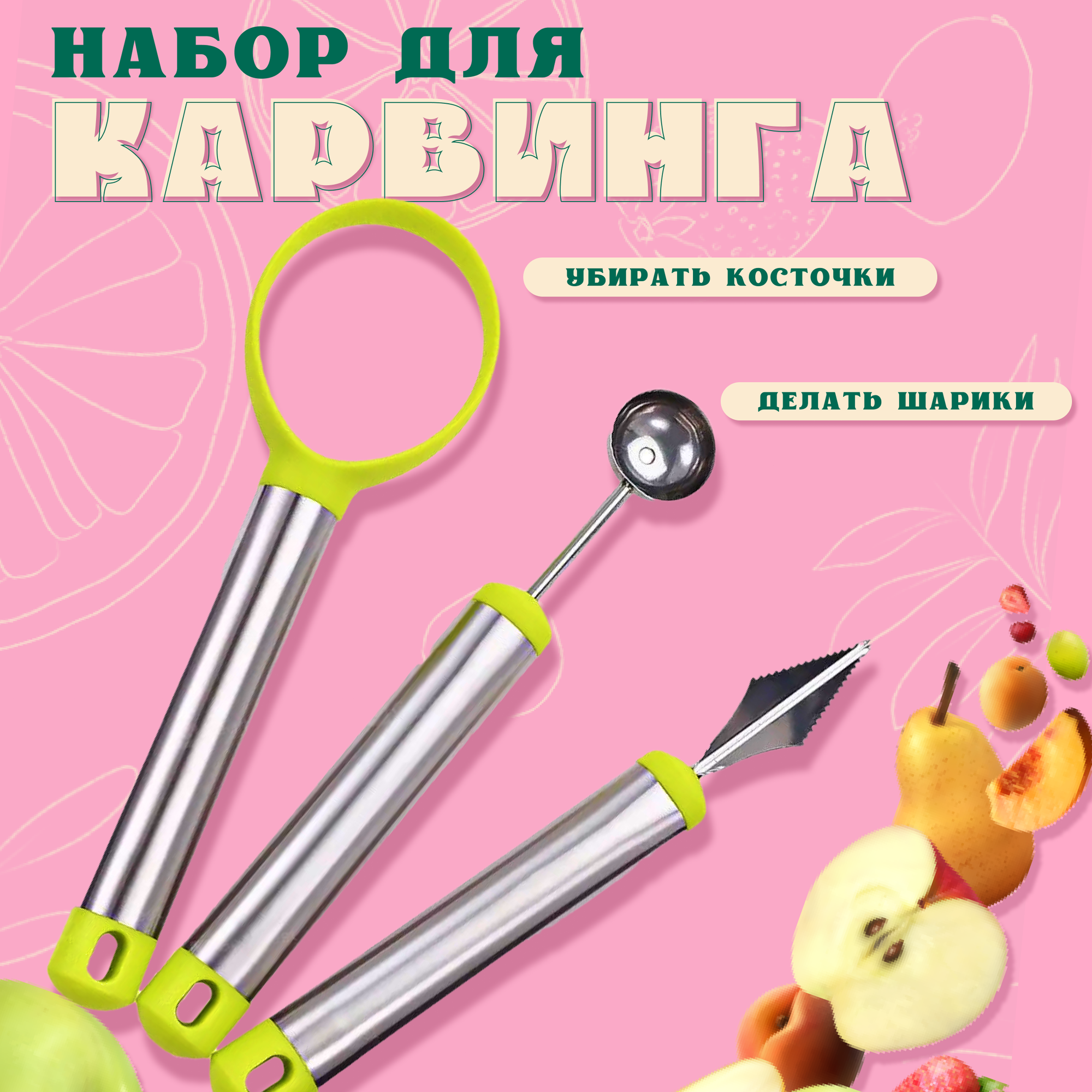 10 цен на Набор для карвинга, ножи для фигурной резки овощей и фруктов, 3 предмета в наборе, зеленый, 21х6,5 см, Kitchen Angel KA-CR-01