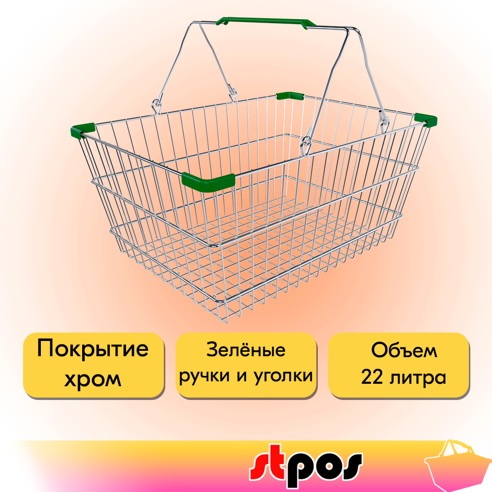 Корзина покупательская металлическая 22л, хром, Зеленые ручки и уголки, 22CR-GN информация: