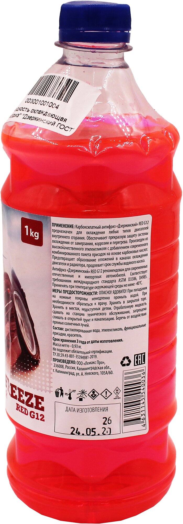 Жидкость охлаждающая антифриз "Дзержинский ГОСТ" G12 (красный) 1 кг (бутылка ПЭТ) информация: