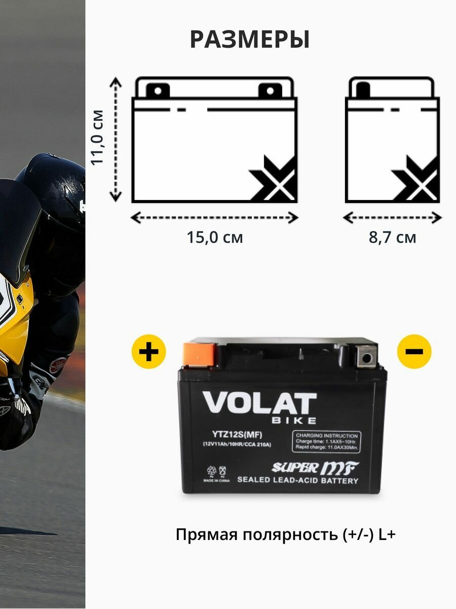 Отзывы на Аккумулятор для мотоцикла 12v Volat YTZ12S(MF) прямая полярность 11 Ah 210 A AGM, акб на скутер, мопед, квадроцикл 150x87x110 мм